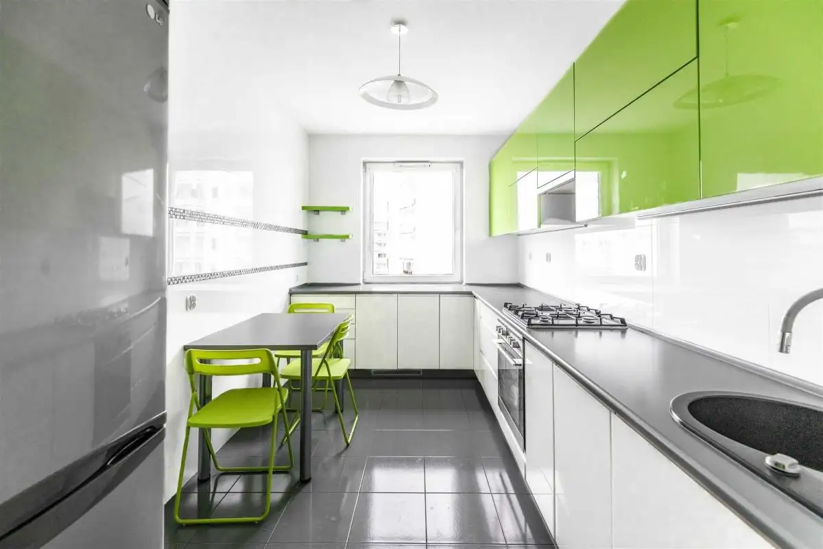 kuchnia o pow. 10m² (zabudowa, AGD: płyta gazowa, okap, piekarnik, lodówka, zmywarka, stół, 3 taborety).