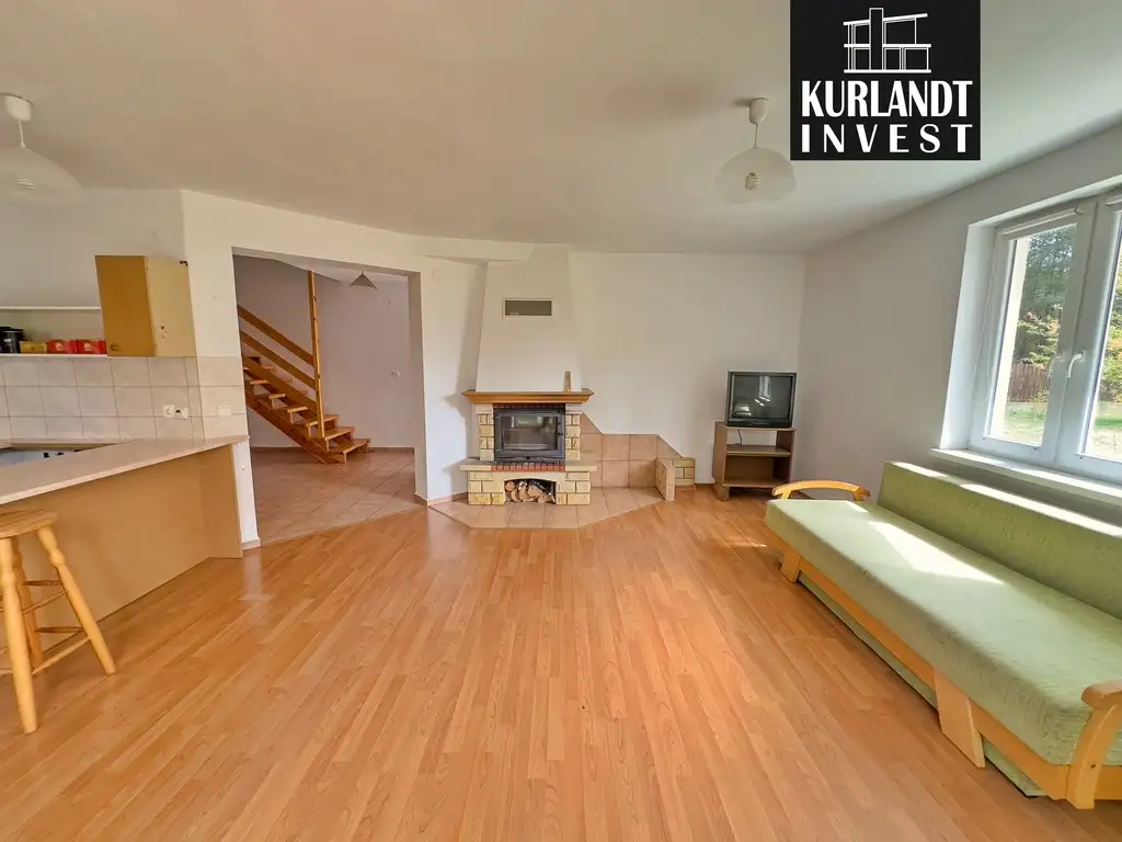parter: salon z kominkiem i wyjściem na taras, kuchnia, sypialnia, łazienka,