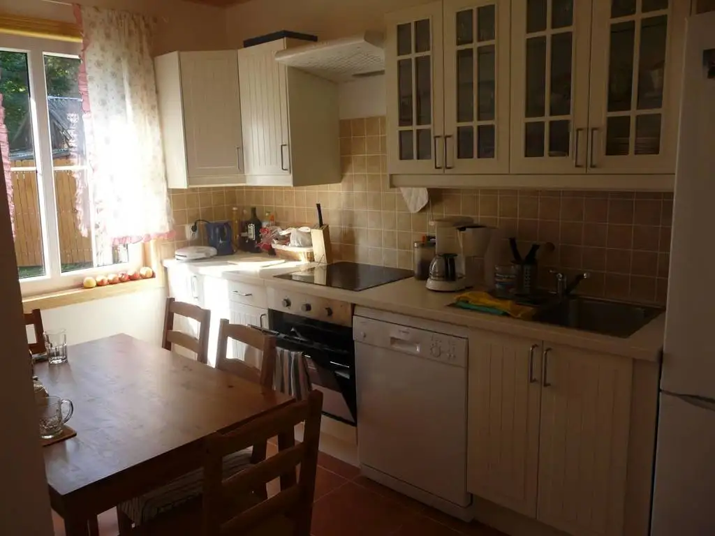 Parter: całkowicie urządzony salon z kominkiem, kuchnia wyposażona w sprzęty AGD, jadalnia z rozsuwanym stołem i krzesłami, łazienka z prysznicem i pralką, pomieszczenie gospodarcze z zapasem drewna kominkowego i sprzętem ogrodowym, wiatrołap. Na parterze znajduje się również zadaszony taras o powierzchni 18 m² i meblami ogrodowymi.