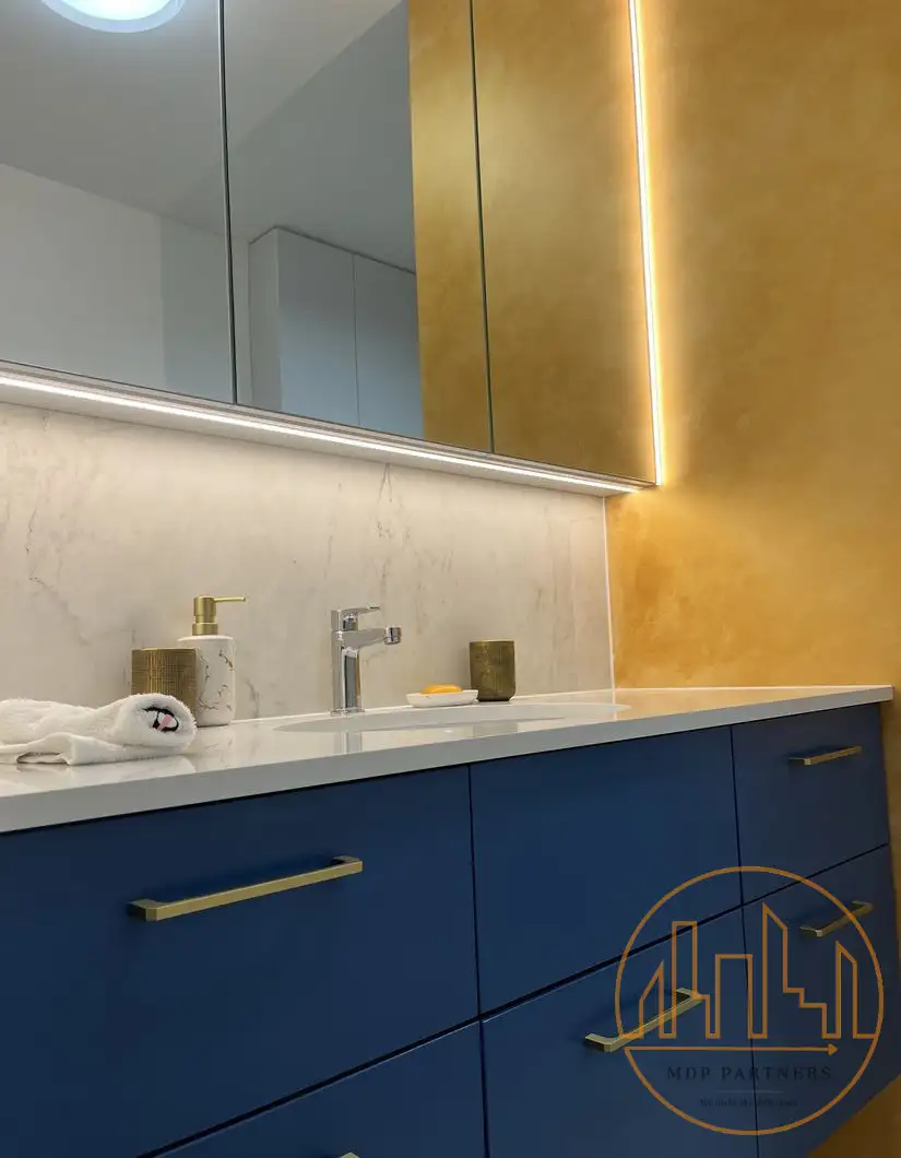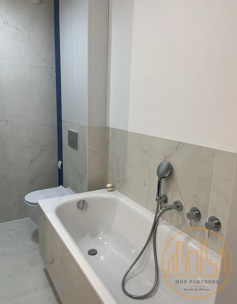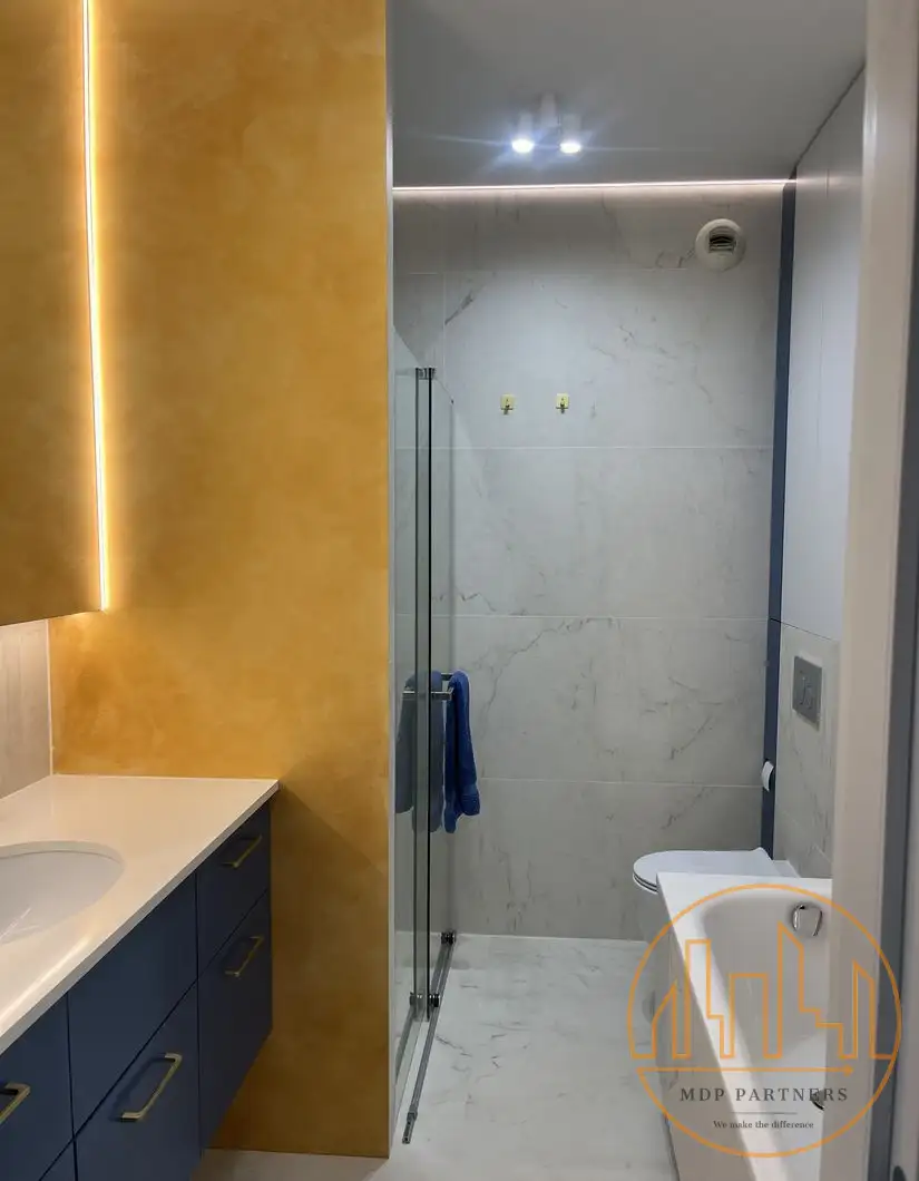 Funkcjonalna łazienka z wanną, kabiną prysznicową z deszczownicą, meblami na wymiar oraz wysokiej jakości włoską ceramiką