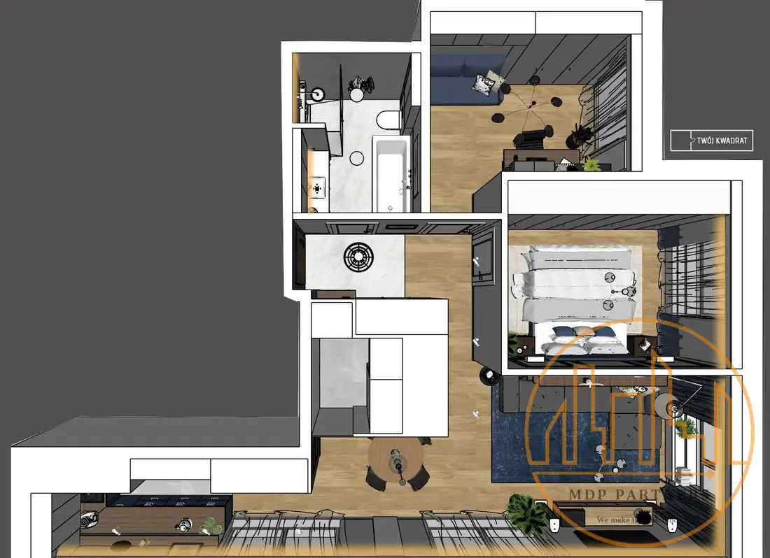 Całkowita powierzchnia mieszkania została starannie zaprojektowana, i podzielona na : - salon połączony z otwartą kuchnią