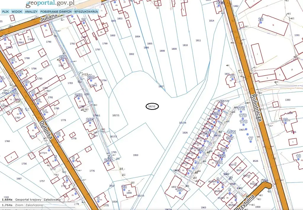 Nieruchomość niezabudowana, nieogrodzona, o nieregularnym kształcie. Teren działki podmokły, porośnięty niską zielenią nieuporządkowaną oraz drzewami. Działka posiada dostęp do drogi publicznej ul. Polcera przez nieurządzoną gminną drogę wewnętrzną (działki ozn. nr geod. 1791, 1796/1, 1817/3). W pobliżu znajdują się sieci uzbrojenia technicznego w postaci sieci elektroenergetycznej, wodociągowej, kanalizacyjnej, gazowej, teletechnicznej. Przyłączenie obiektu do sieci infrastruktury technicznej możliwe będzie na warunkach określonych przez dysponentów sieci. Według klasyfikacji użytków zawartej w ewidencji gruntów i budynków działka stanowi łąki trwałe (ŁV) oraz nieużytki (N).