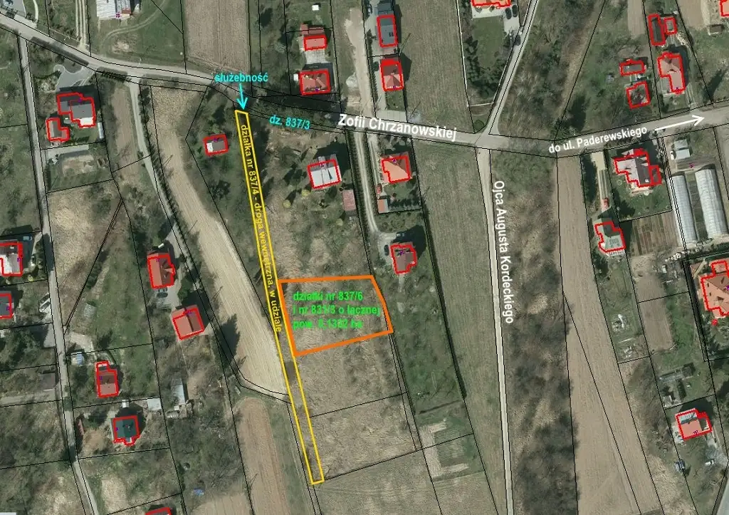 2. Działki są niezabudowane i tworzą kompleksy o łącznych powierzchniach odpowiednio: 0,1332 ha, 0,1294 ha i 0,1280 ha, o regularnych kształtach zbliżonych do prostokątów. Teren nieruchomości płaski, porośnięty drzewami, krzewami i trawami. Działki nr 831/3, 831/4 i 831/5 zostały ogrodzone od strony wschodniej. Przedmiotowe działki nie przylegają bezpośrednio do drogi publicznej. Dojazd do ul. Zofii Chrzanowskiej odbywać się będzie przez działkę nr 837/4 (w której zbywany jest udział w prawie własności) oraz przez działkę nr 837/3 w obrębie 201, przeznaczoną na poszerzenie tej ulicy. Z tego względu, przy każdej sprzedaży ustanowiona zostanie odpłatna służebność gruntowa przechodu i przejazdu przez działkę nr 837/3 w obrębie 201, na rzecz każdoczesnych właścicieli działki nr 837/4 w obrębie 201. Jednorazowe wynagrodzenie z tytułu ustanowienia ww. służebności wynosi po 1 000,00 zł (słownie: jeden tysiąc złotych 00/100) brutto (w tym 23% VAT). Działka nr 837/3 jest ogrodzona trwałym ogrodzeniem od strony ulicy, przy czym ogrodzenie nie pokrywa się z granicą działki. Działka nr 837/4 (przeznaczona pod ciąg komunikacyjny) jest zadrzewiona oraz ogrodzona od strony zachodniej, przy czym ogrodzenie nie pokrywa się z granicą działki.