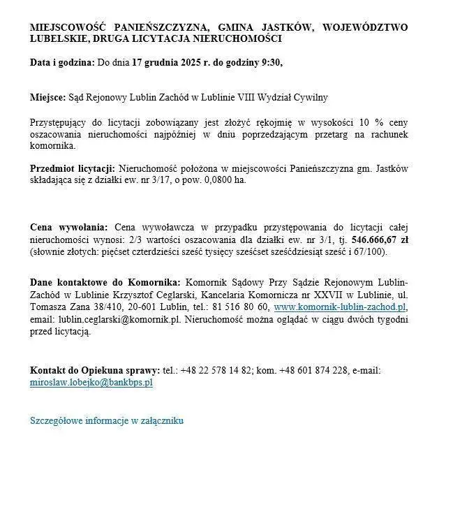 MIEJSCOWOŚĆ PANIEŃSZCZYZNA, GMINA JASTKÓW, WOJEWÓDZTWO LUBELSKIE, DRUGA LICYTACJA NIERUCHOMOŚCI
