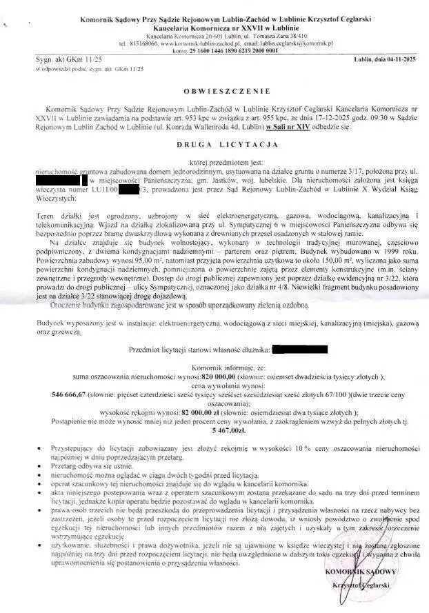[Email protected]. Nieruchomość można oglądać w ciągu dwóch tygodni przed licytacją.