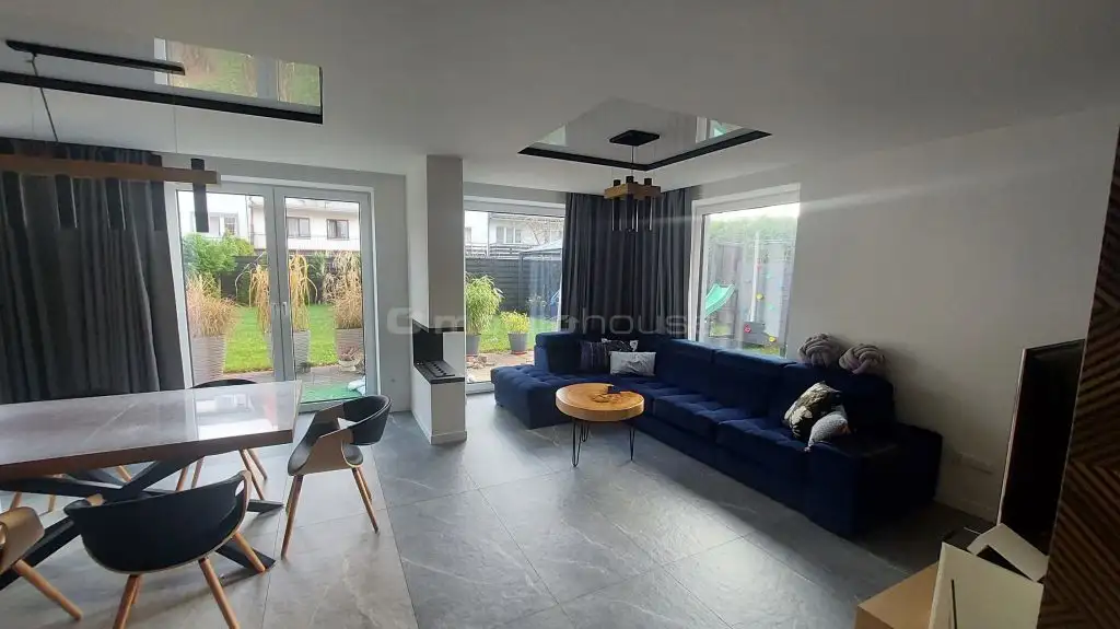 Zastosowano bardzo wysokiej jakości materiały do wykończenia wnętrz - panele winylowe, płytki sprowadzane z Włoch i Hiszpanii,łóżka, stoły wykonane na zmówienie, okna 3-szybowe antywłamaniowe, drzwi wejściowe i brama garażowa antywłamaniowa. Rozprowadzona instalacja pod montaż alarmu i kamer. Garaż z kanałem, kanał suchy- nie przecieka. Tarasy zaizolowane, oddzielne domofony, oddzielne wejścia. Dom jest świetnie docieplony z wysokiej jakości materiałów. Jest jak termos - latem zaznamy ochłody w upalne dni, a zimą trzyma ciepło wewnątrz, gdy na dworze panuje minusowa temperatura. W domu zastosowano nowoczesne i energooszczędne rozwiązania, w tym panele fotowoltaiczne, które zostały zainstalowane w 2020 roku. System składa się z 12 paneli, które od kwietnia do września generują praktycznie zerowe koszty utrzymania domu. Umowa z Energą została podpisana na najlepszych możliwych warunkach na rynku, co pozwala na przechowywanie nadwyżki wyprodukowanej energii w elektrowni i odzyskiwanie jej aż w 80% zaoszczędzonej energii do ponownego zużycia. Fotowoltaika podłączona na starych zasadach.