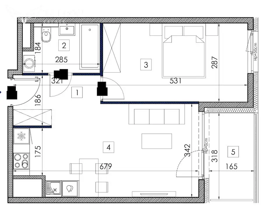 Układ mieszkaniasalon z aneksem kuchennym - 20,69 m²