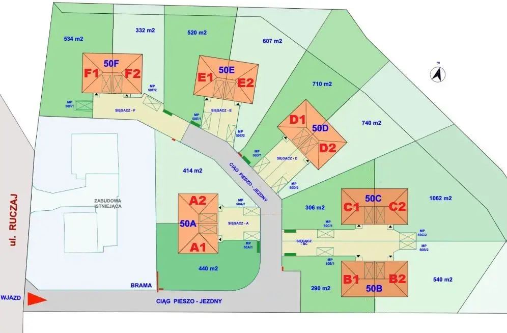 The Green Ruczaj estate is a small enclave of peace and quiet, with a landscaped common area and greenery, to which an automatic gate with an access control gate leads. The entire estate is fenced and surrounded by greenery. Each house comes with a garden of varied shape and size ranging from 290 to as much as 1062 m², so you will be able to choose the garden area according to your needs.