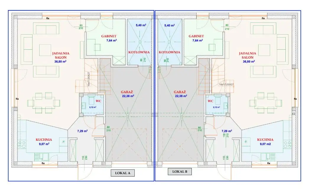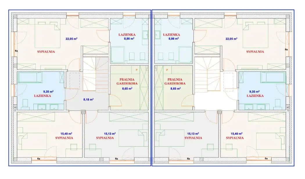 Każdy budynek posiada 2 kondygnacje, na których znajdują się: