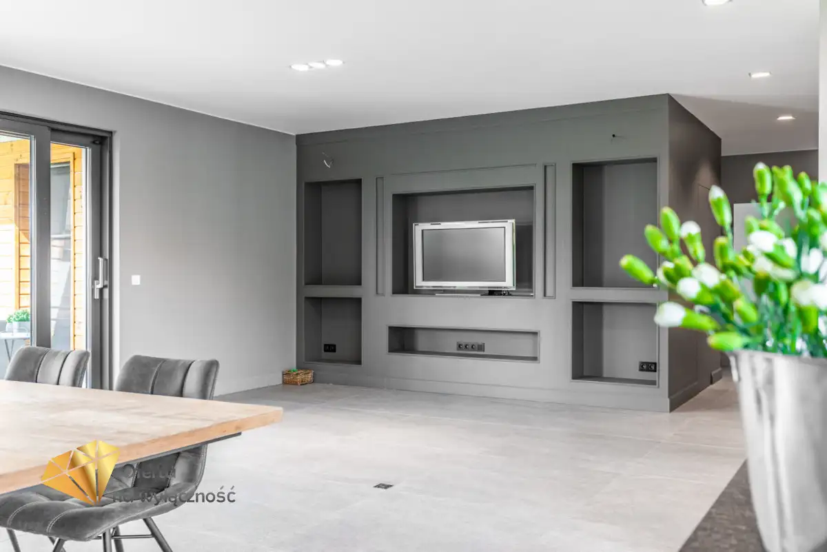 - Garaż: dwustanowiskowy w bryle budynku (ok. 36m²)