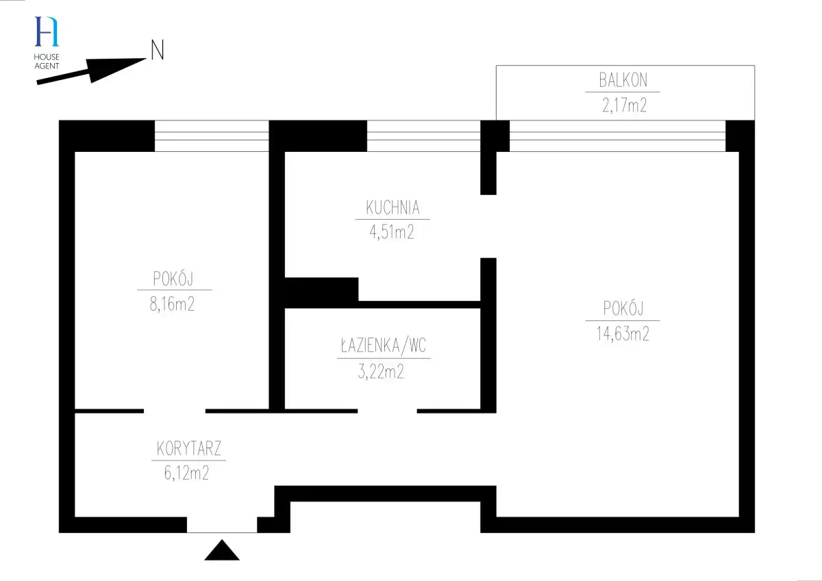 mieszkania wchodzą: pokój (8,16m²), pokój dzienny (14,63m²) połączony z kuchnią (4,51m²), łazienka z ubikacją (3,22m²) oraz przestronny korytarz (6,12m²).