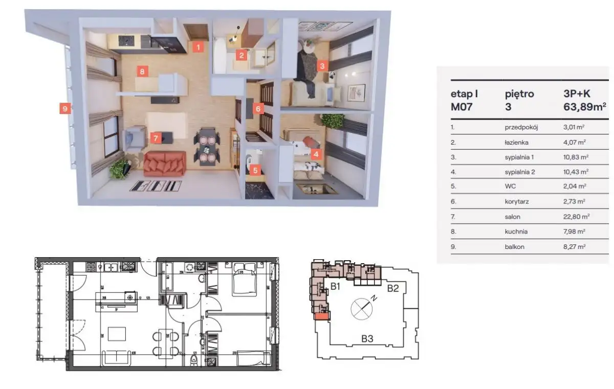 Trzypokojowe mieszkanie o powierzchni projektowej 63,89 m² z wystawą okien na północny-zachód i południowy-wschód