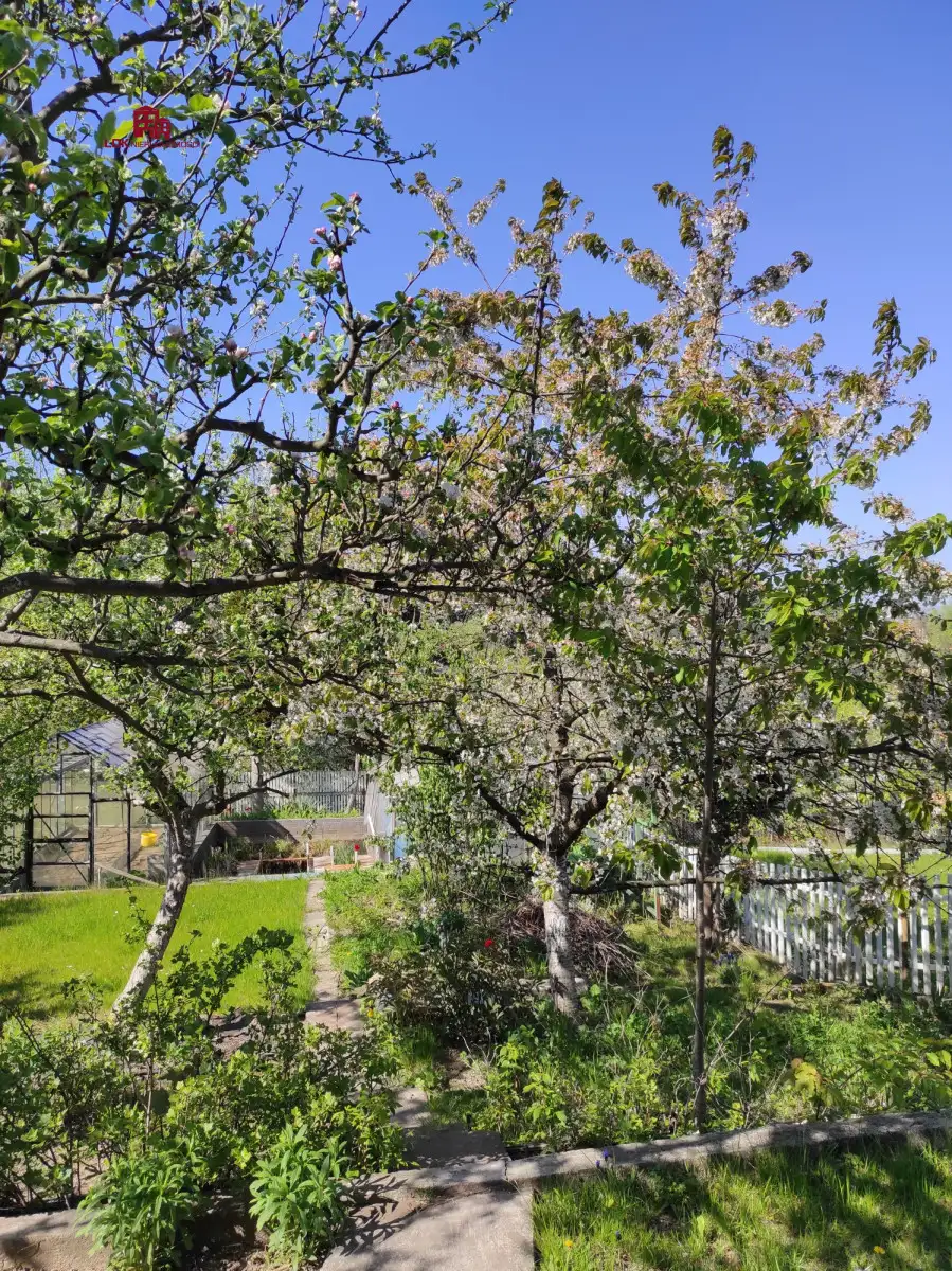 Drzewa owocowe: 2 jabłonie, czereśnia oraz krzewy porzeczek,