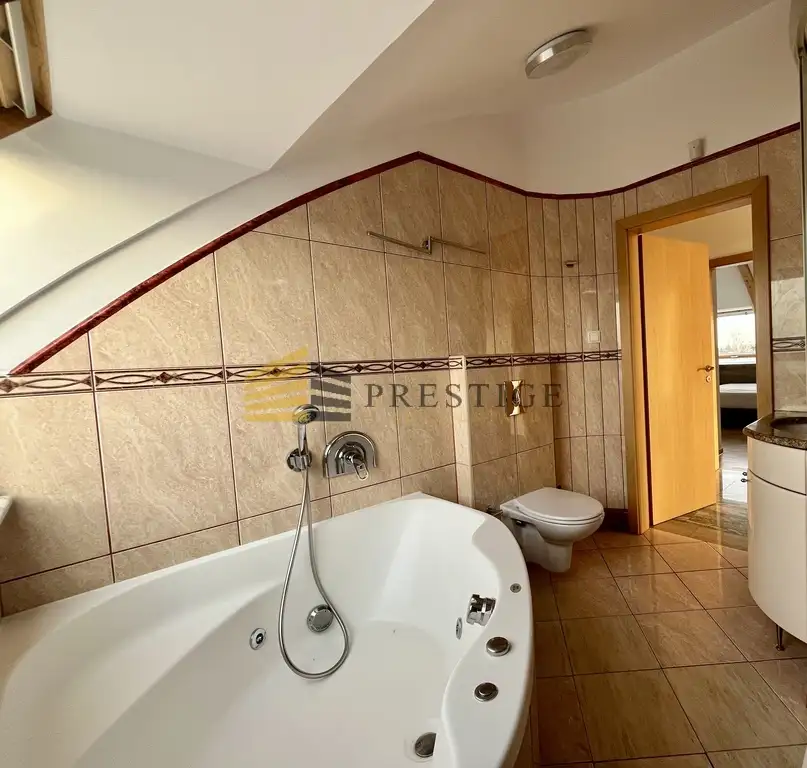 The apartment consists of 3 rooms, 2 bedrooms, a large living room with dining area. An open, fully furnished kitchen with a large marble work surface leads to the dining area. There is also a bathroom with a hydromassage bath and shower, as well as a guest toilet. The apartment also has air conditioning, an alarm system, a parquet floor, a large balcony overlooking the green birches in summer.