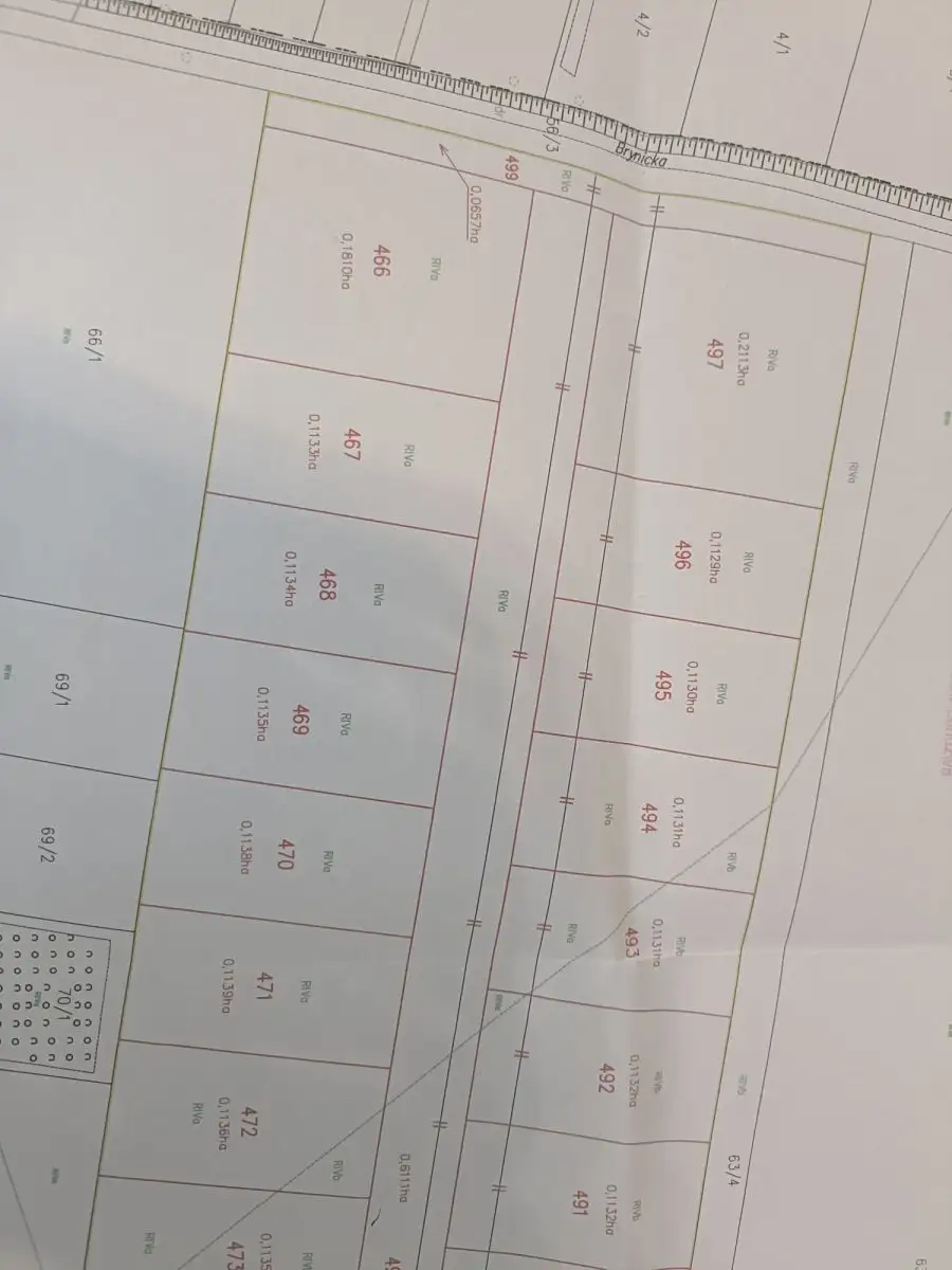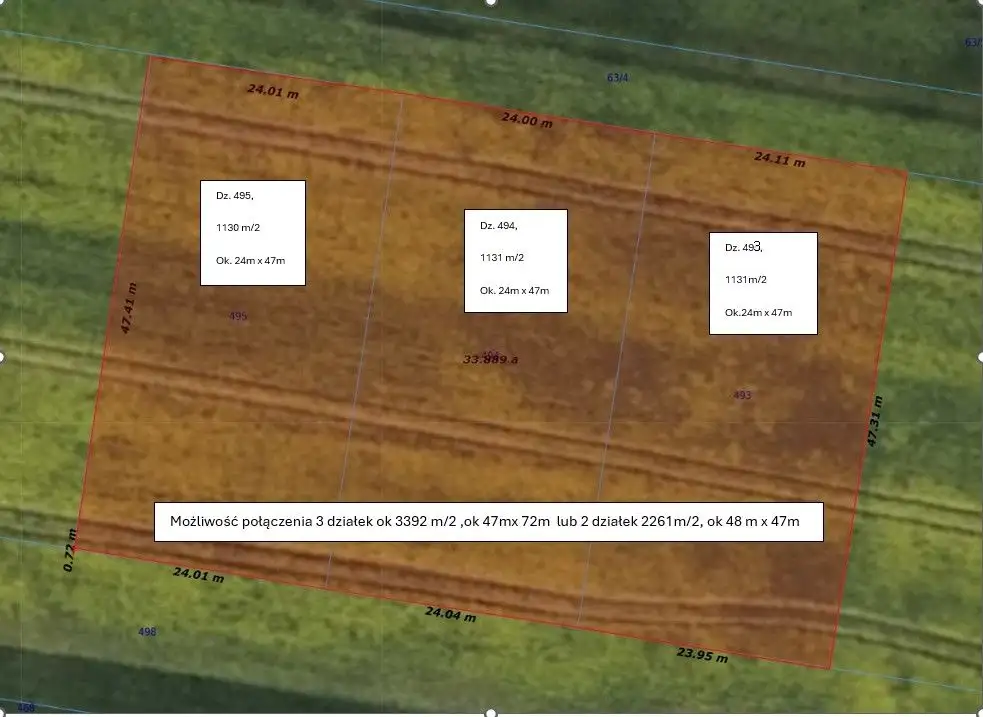 Możliwe jest także połączenie dwóch lub trzech parceli, co daje odpowiednio 2261 m² lub 3392 m². Wszystkie działki mają kształt prostokąta, a teren jest płaski i znajduje się na lekkim wzniesieniu.
