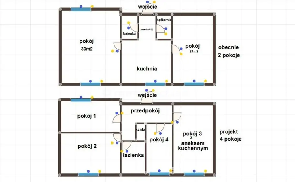 Największy pokój ma ok. 33m², więc z łatwością można go przerobić na dwa, w mniejszym pokoju spokojnie się zmieści aneks kuchenny, a kuchnię przekształci się w łazienkę i kolejny pokój (propozycja zmian na ostatnim zdjęciu). Nad mieszkanie znajduje się strych ok. 70m², który może posłużyć za kolejny pokój lub nawet mieszkanie.