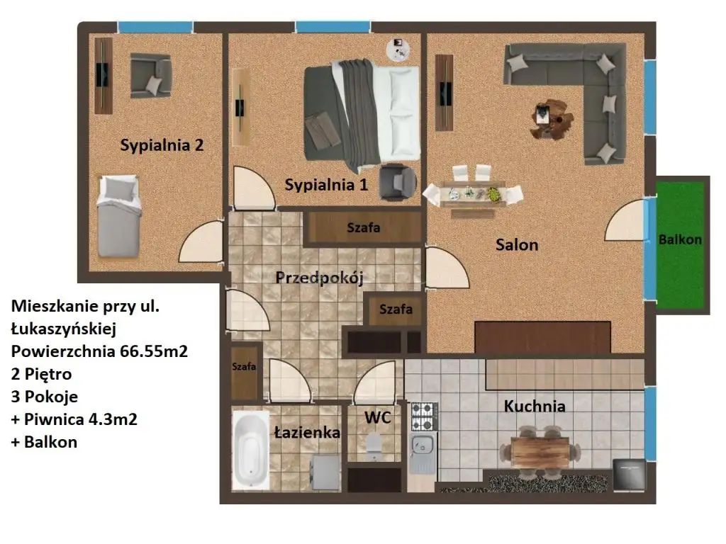 Nieruchomość o powierzchni 66,55 m², znajduje się na 2 piętrze, a w jego skład wchodzą:
