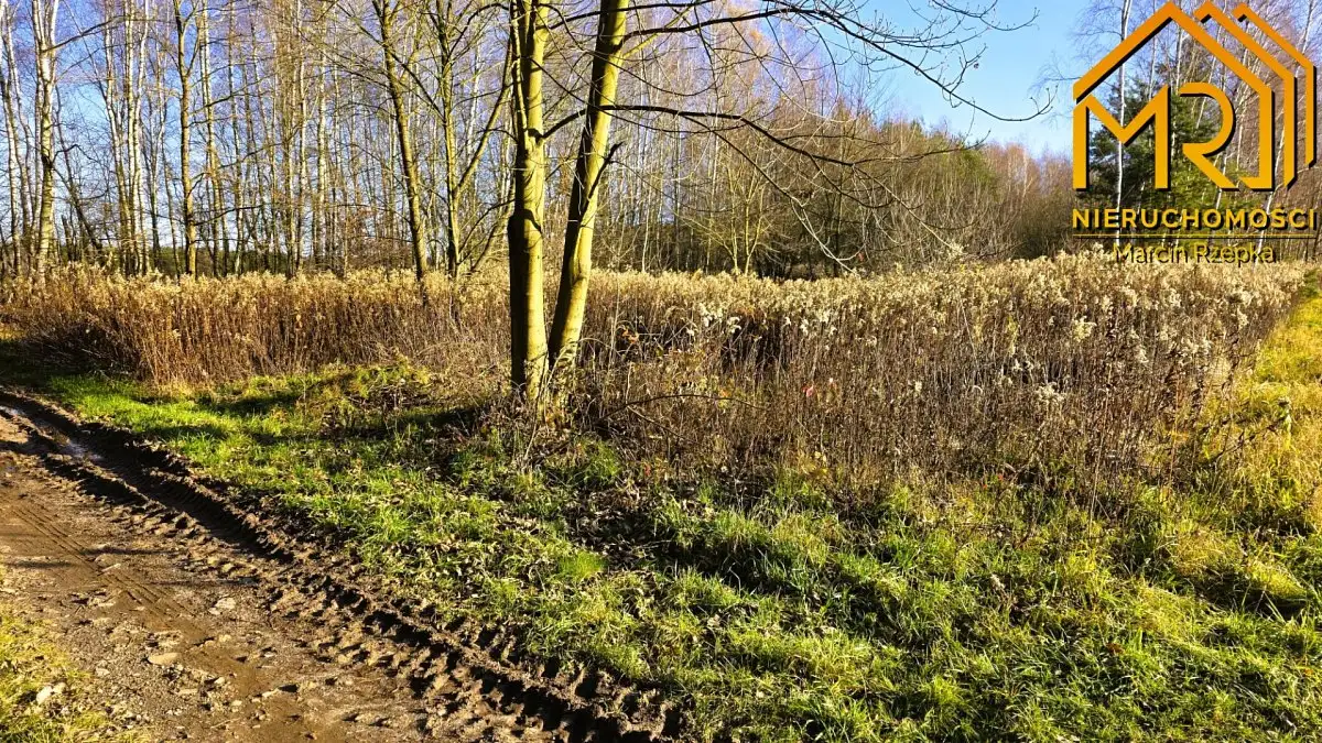 Parcela ma kształt prostokąta, teren jest płaski, częściowo porośnięty drzewami, samosiejką.
