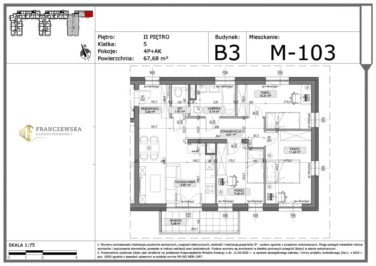 Trzypokojowe mieszkanie o powierzchni projektowej 67,68 m² położone na drugim piętrze w budynku z wystawą okien na południe i wschód.
