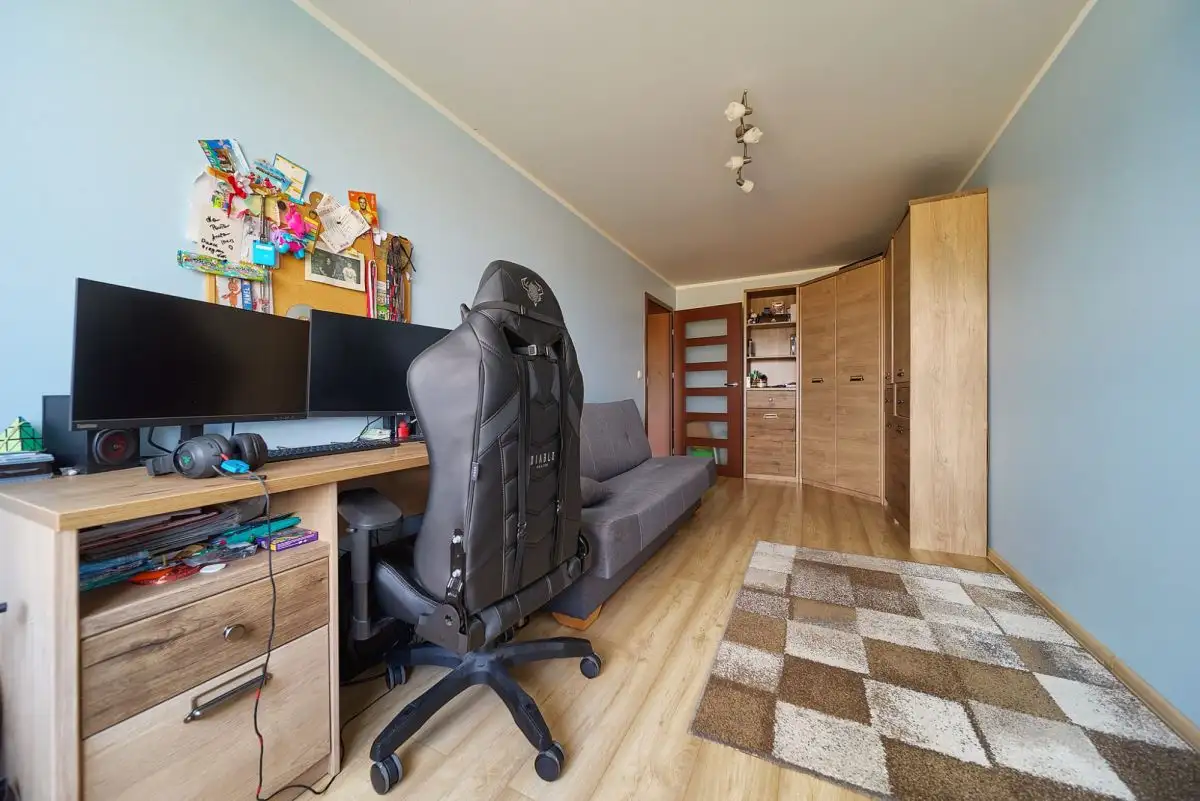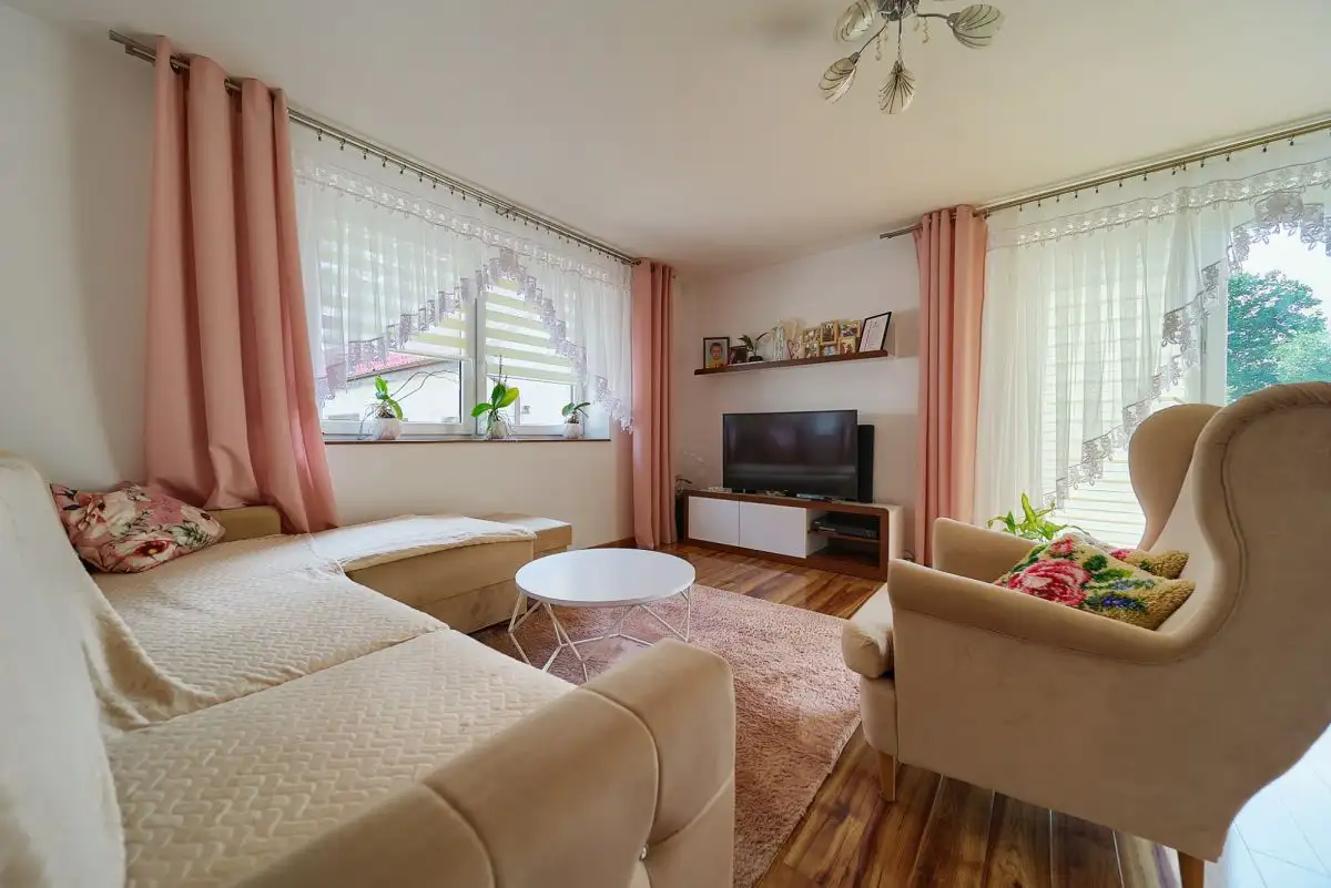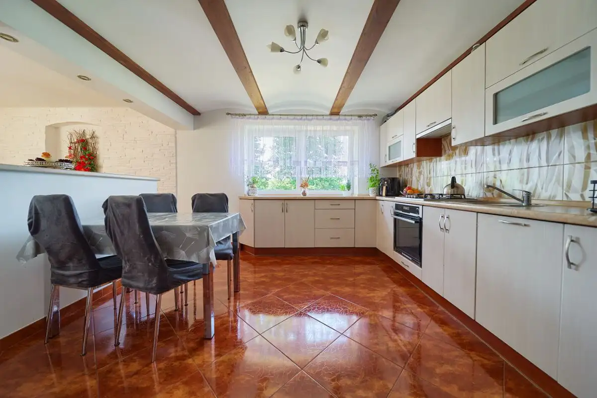 Dom główny oferuje przemyślany układ pomieszczeń. Na parterze znajduje się przestronny salon z jadalnią i wyjściem na taras, w pełni wyposażona kuchnia, łazienka z prysznicem i WC oraz trzy pokoje, w tym jeden z szafą w zabudowie. Z wiatrołapu prowadzi wejście na strych oraz zejście do piwnicy - połowa domu jest podpiwniczona. Dodatkowe pomieszczenie gospodarcze to prawdziwy bonus - wyposażone w drugą kuchnię oraz kotłownię z piecem na ekogroszek z 2014 roku, może funkcjonować jako niezależna jednostka mieszkalna lub zaplecze dla działalności gospodarczej.