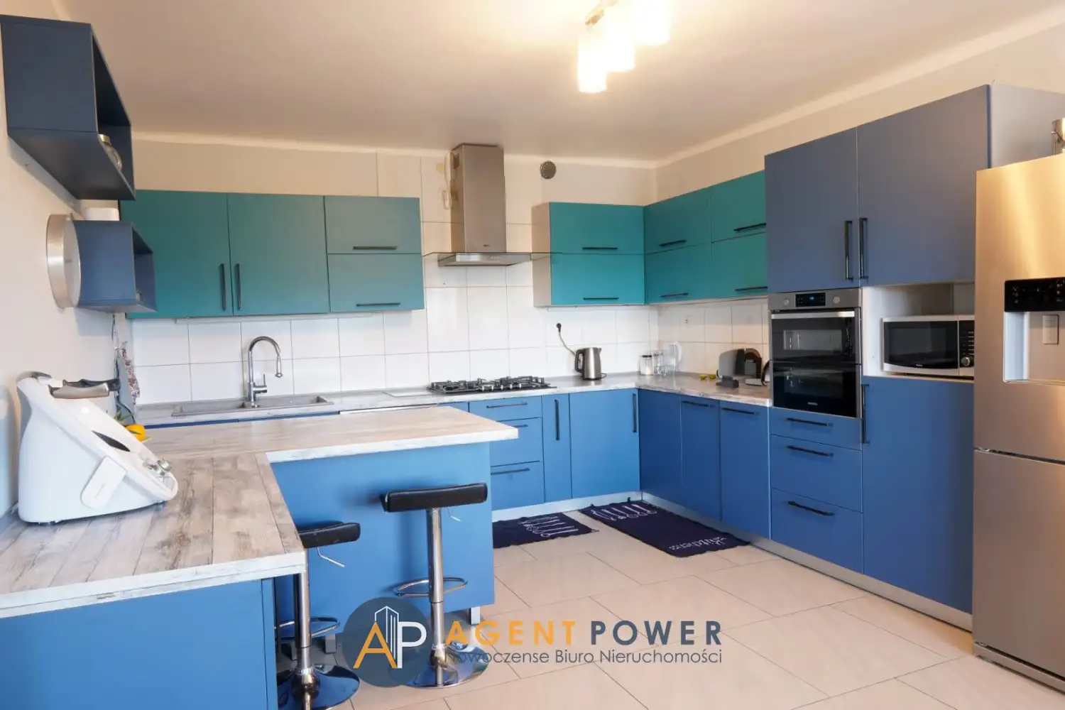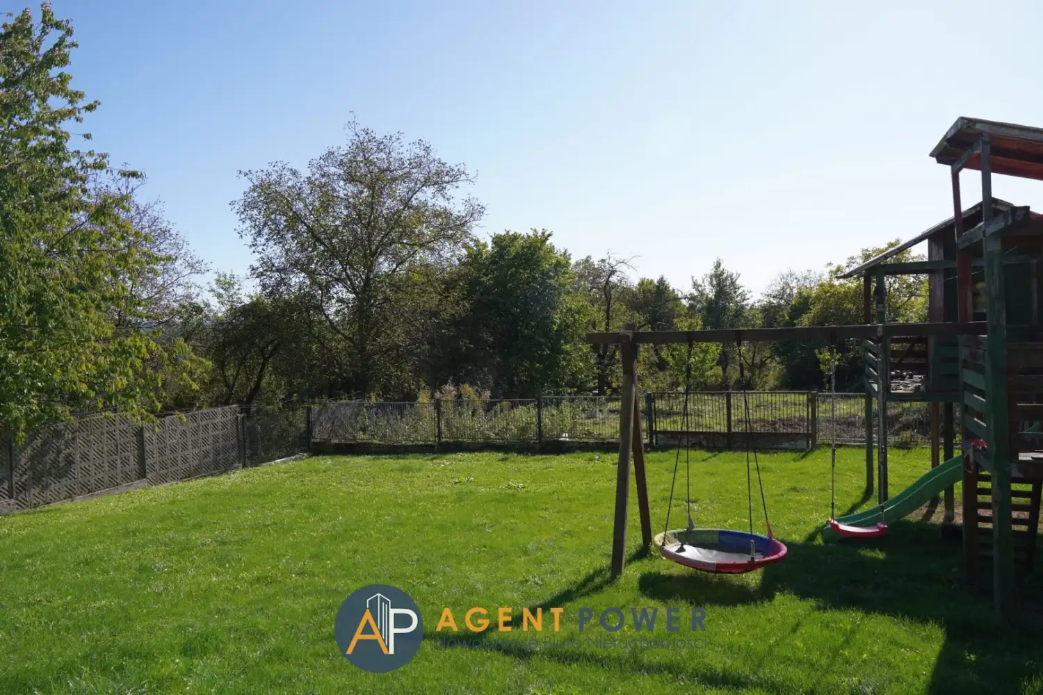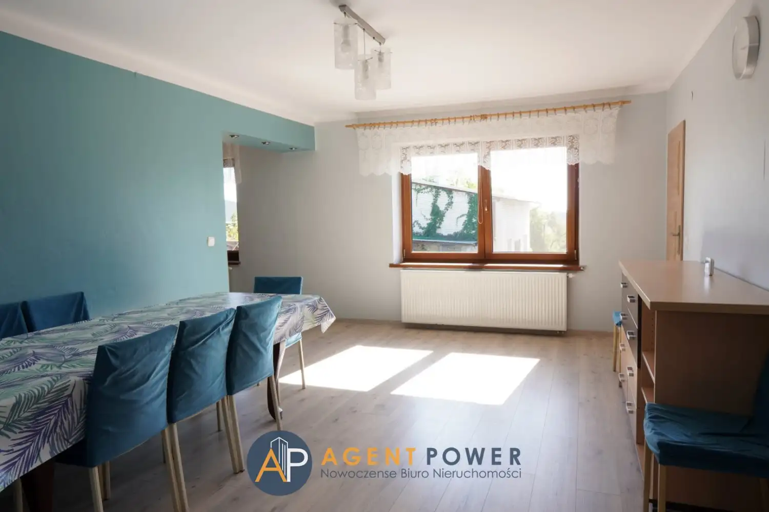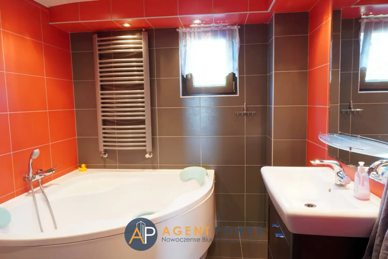 Dom posiada dwa tarasy: dolny z wejściem do budynku oraz górny z panoramicznym widokiem na okolicę. Na tyłach posesji znajduje się zielony teren z trawnikiem i placem zabaw. Duża kuchnia jest w pełni wyposażona w meble i AGD (zmywarka, kuchenka, okap, lodówka, piekarnik). Na podłogach znajdują się panele i płytki. Łazienka na parterze wyposażona jest w prysznic i WC, a na piętrze w wannę i WC. Dom posiada napęd do bramy wjazdowej, co zwiększa komfort codziennego użytkowania.