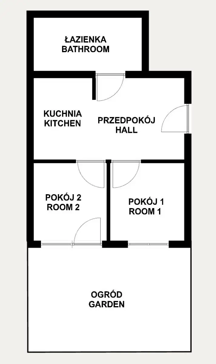 Pokoje: pokój 1, pokój 2, otwarta kuchnia, przedpokój, łazienka, ogród