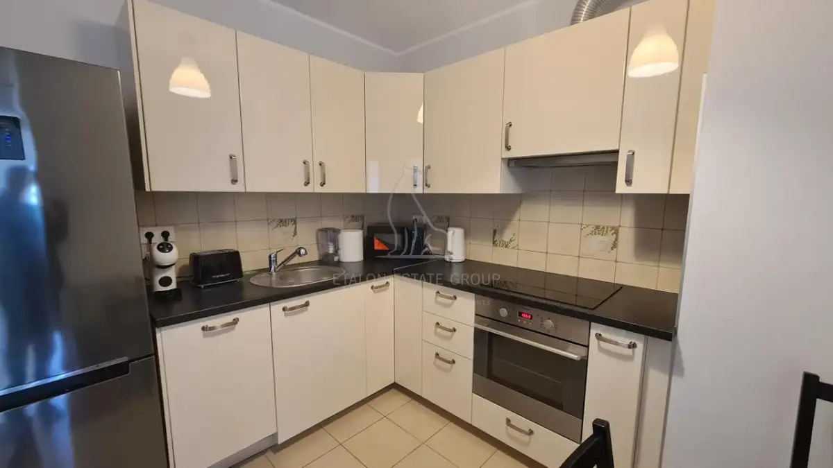 - Salon: Przestronny, z zamkniętym aneksem kuchennym wyposażonym w sprzęt AGD. Z salonu wyjście na balkon. Znajduje się tu również rozkładana sofa.