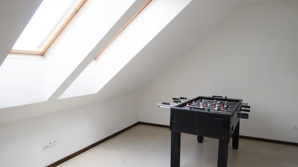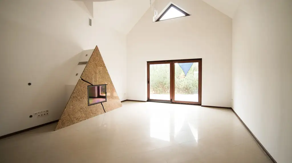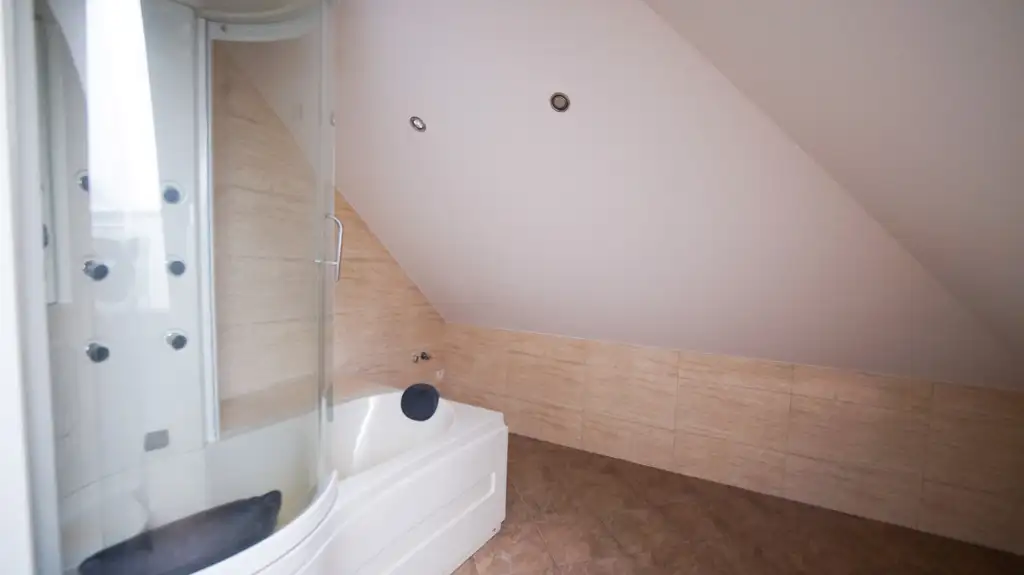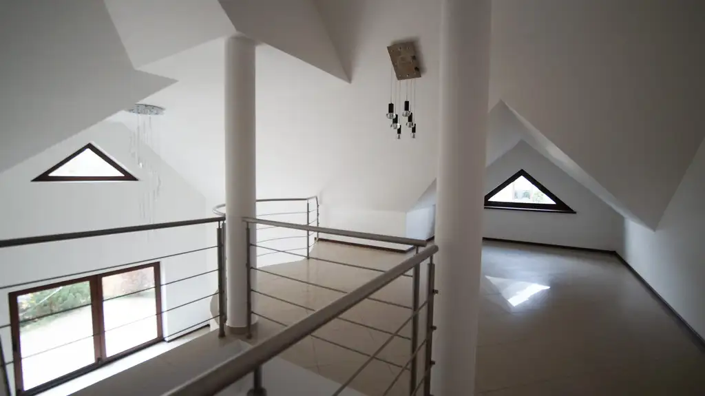 piętro: trzy pokoje, łazienka, duża antresola. W salonie znajduje się kominek.