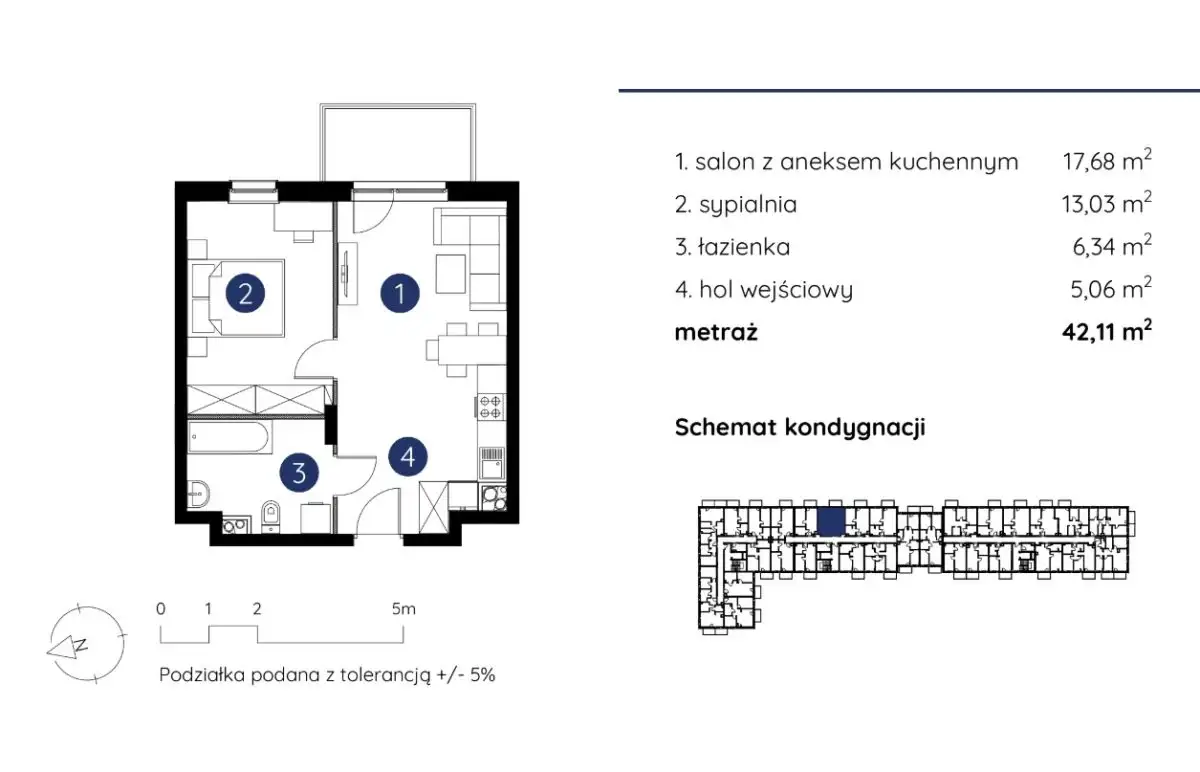 Dwupokojowe mieszkanie o powierzchni projektowej 42,11 m² na 0 p. / 5 p. na Bazylianówce.