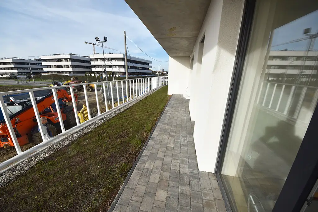 Na parterach znajdują się zielone tarasy, natomiast na wyższych kondygnacjach – loggie z balustradami z przyciemnianego szkła, gwarantujące prywatność i elegancki wygląd elewacji.