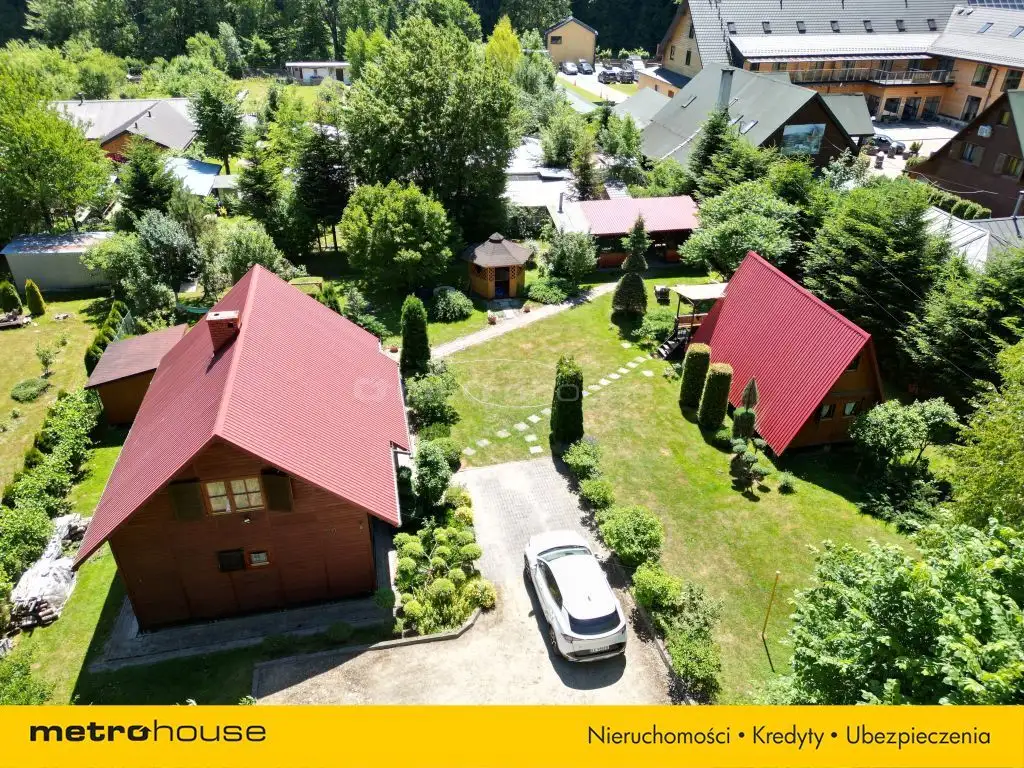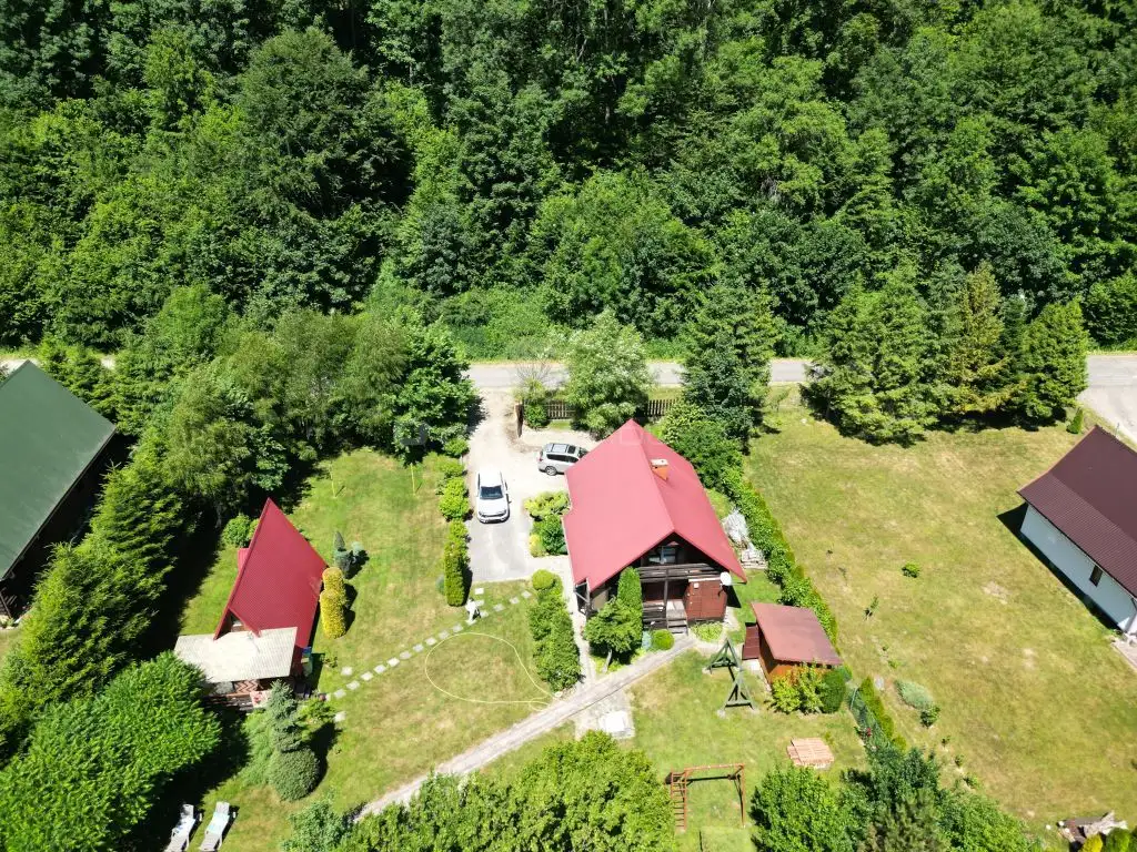 Oferuję na sprzedaż dwa domki letniskowe usytuowane na 14 arowej działce w miejscowości Rajskie, znajdującej się w centralnej części regionu turystycznego Bieszczad, nieopodal miejscowości wypoczynkowej Polańczyk. Działka płaska, ogrodzona bramką z bezpośrednim dojazdem z drogi asfaltowej. Domki zostały wybudowane w 2006 roku w konstrukcji szkieletowej drewnianej. Wyposażone zostały w media tj. wodę ze studni głębinowej, prąd oraz kanalizację typu szambo oraz internet światłowodowy. Większy z domków posiada dodatkowo ogrzewanie za pomocą pieca typy koza. Powierzchnia użytkowa domku większego to około 95 m², a mniejszego około 47 m². Obydwa budynki posiadają parter i piętro użytkowe. W skład pomieszczeń większego wchodzą salon, łazienka, aneks kuchenny i pokój (parter) oraz dwie sypialnie, korytarz i balkon (1 piętro). Na terenie działki znajdują się również altana wypoczynkowa, grillownia i budynek gospodarczy.