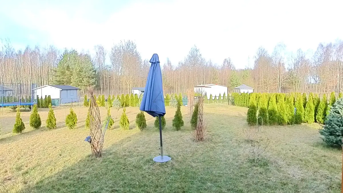Działka około 500 m², wyrównana i odchwaszczona, z wysianą trawą i nasadzeniami