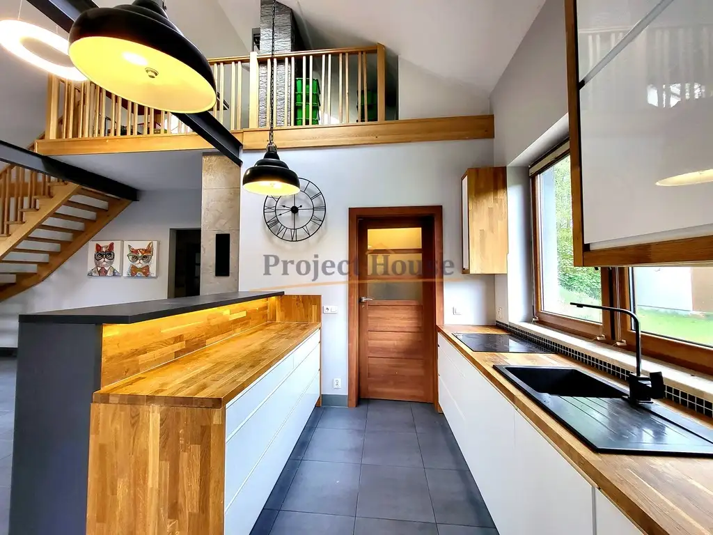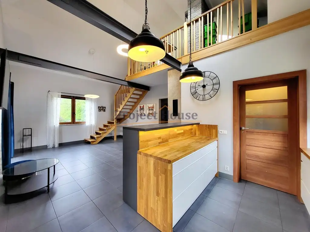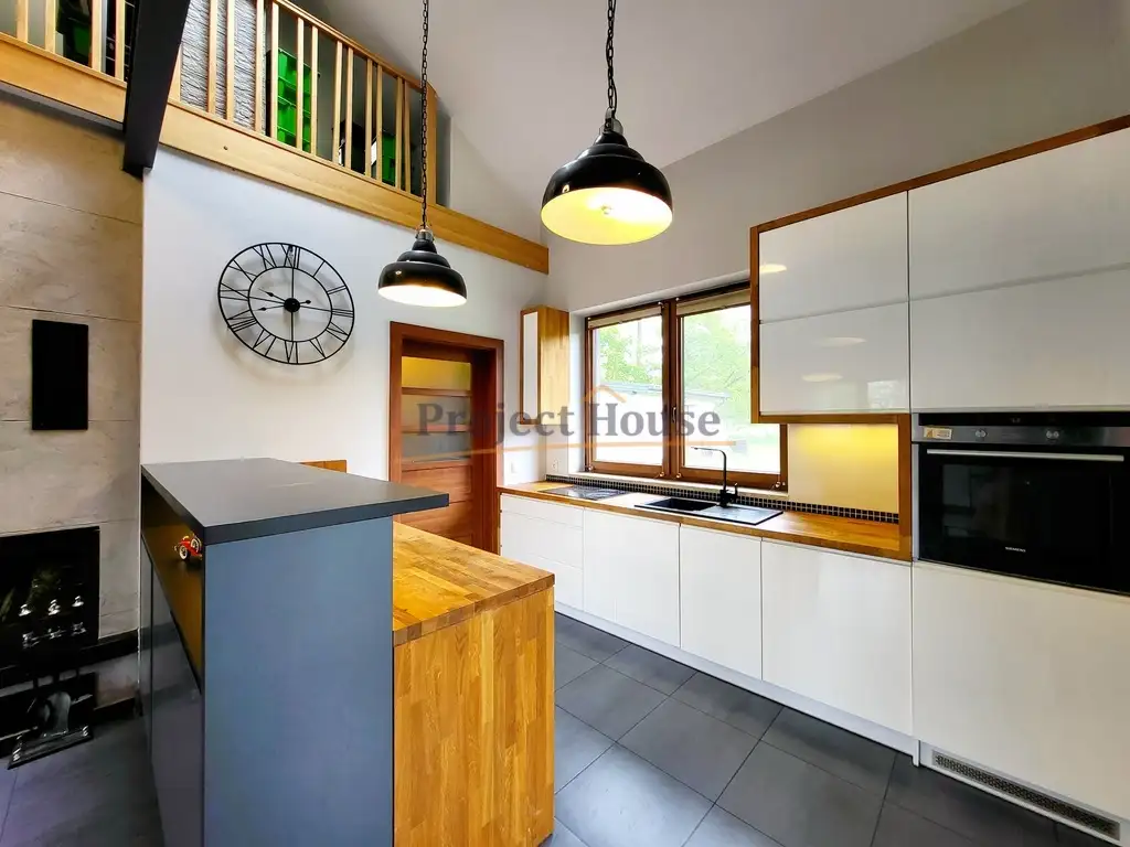 W części mieszkalnej dom posiada 4 pokoje: salon, 2 sypialnie oraz antresole. Kuchnia wyposażona w nowoczesne szafki pod wymiar z dębowymi blatami, zmywarkę, piekarnik, płytę indukcyjną oraz piękną wyspę. Łazienka wyposażona w wannę, duża umywalkę z lustrem oraz szafki pod wymiar.