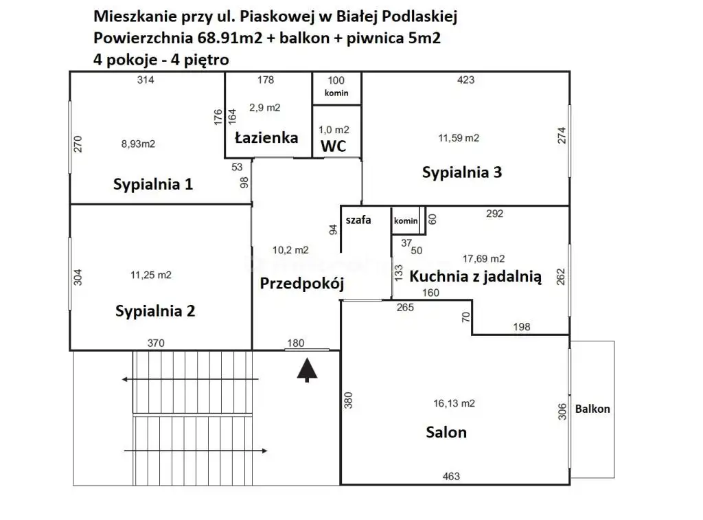 Nieruchomość o powierzchni 68.91m², położona jest na 4 piętrze, a w jej skład wchodzą: