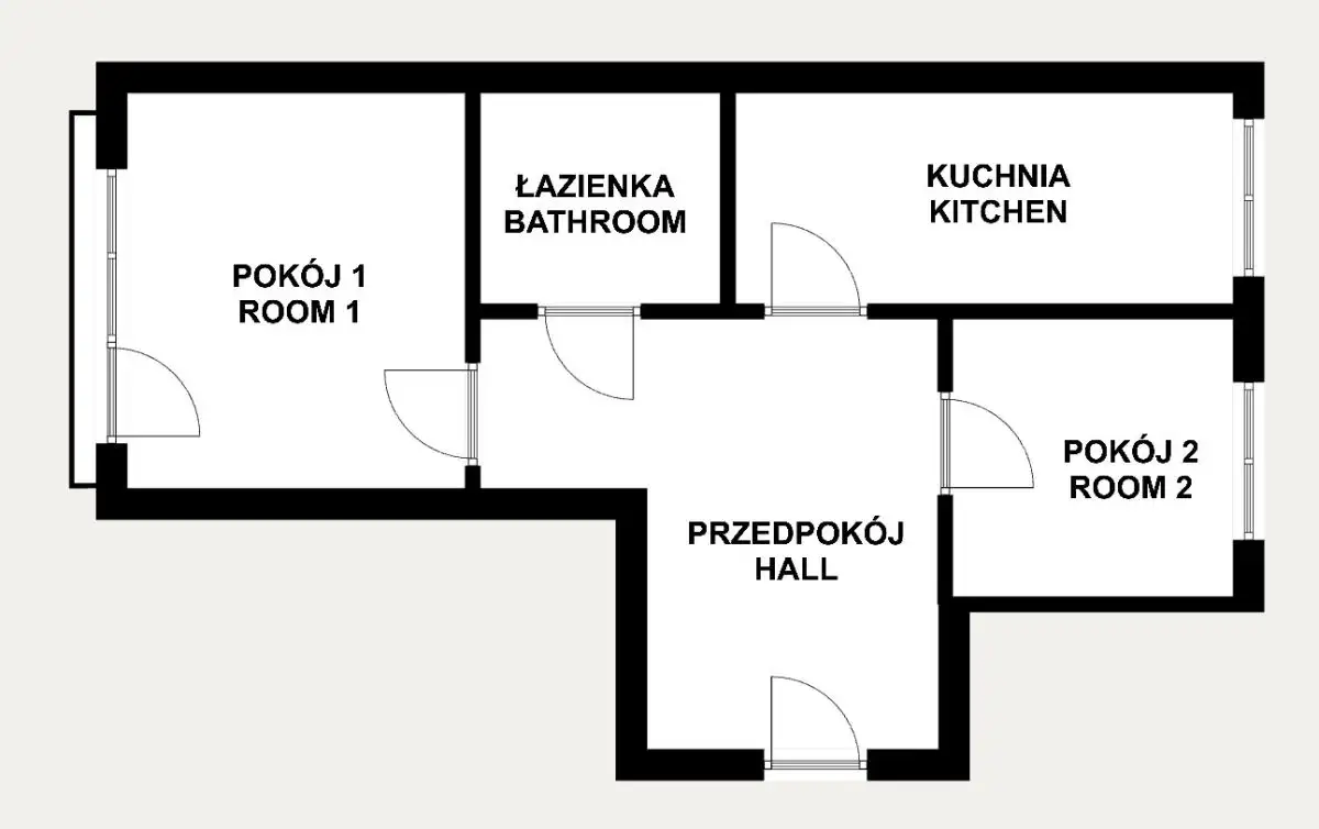 Pokoje: 1 pokój, 2 pokój, kuchnia, przedpokój, łazienka
