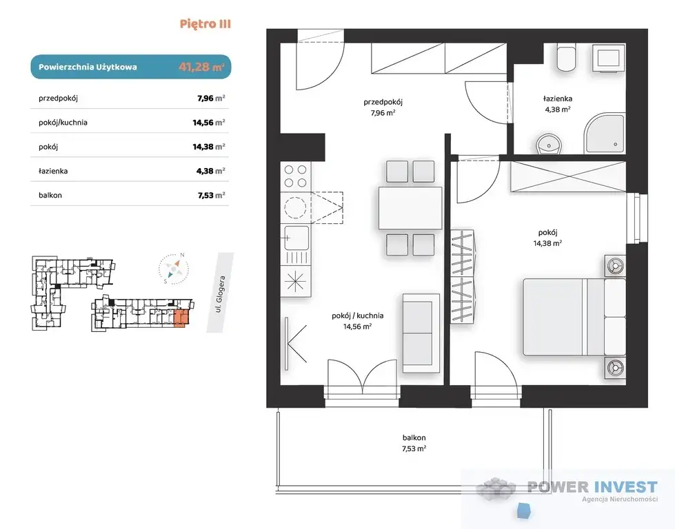 Mieszkanie znajduje się na 3 - ostatnim piętrze. Nieruchomość ma powierzchnię 41,28 m² i składa się z: