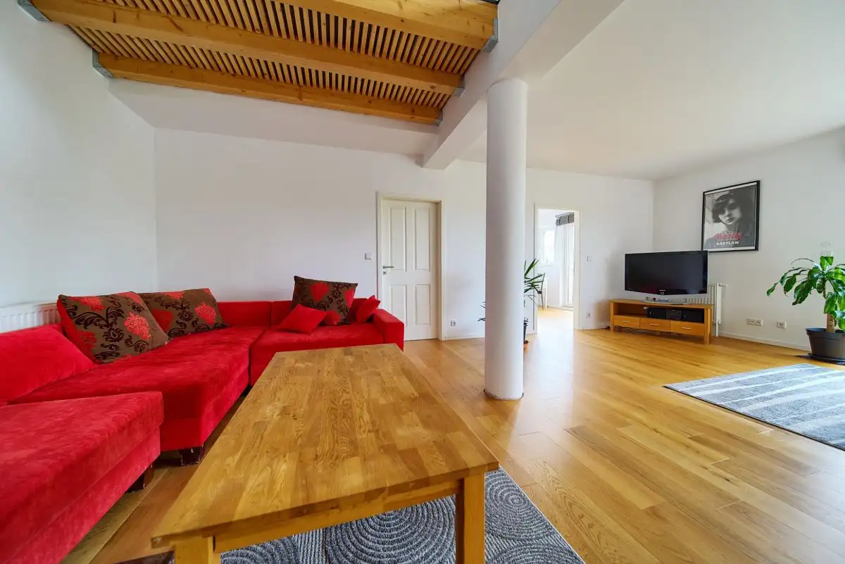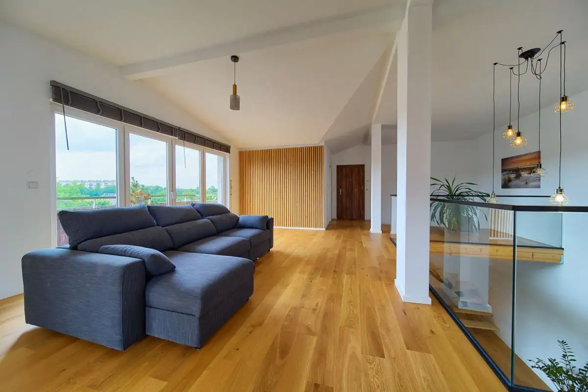 Z tej samej centralnej klatki schodowej dostępne jest również niezależne, komfortowe mieszkanie rodzinne. Funkcjonalny układ obejmuje jasną kuchnię otwartą na przytulny salon, tworząc idealne miejsce do wspólnego spędzania czasu, trzy ustawne, dobrze doświetlone sypialnie zapewniające prywatność każdemu z domowników, oraz nowoczesną łazienkę z WC. To doskonała propozycja dla rodziny z dziećmi lub jako atrakcyjna inwestycja pod wynajem.