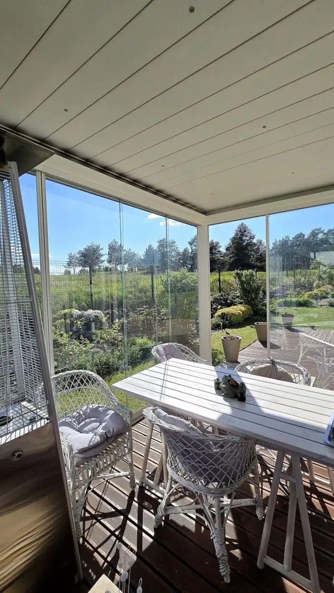 - Wyjście z salonu na taras oraz przeszklone patio z rozsuwanym systemem