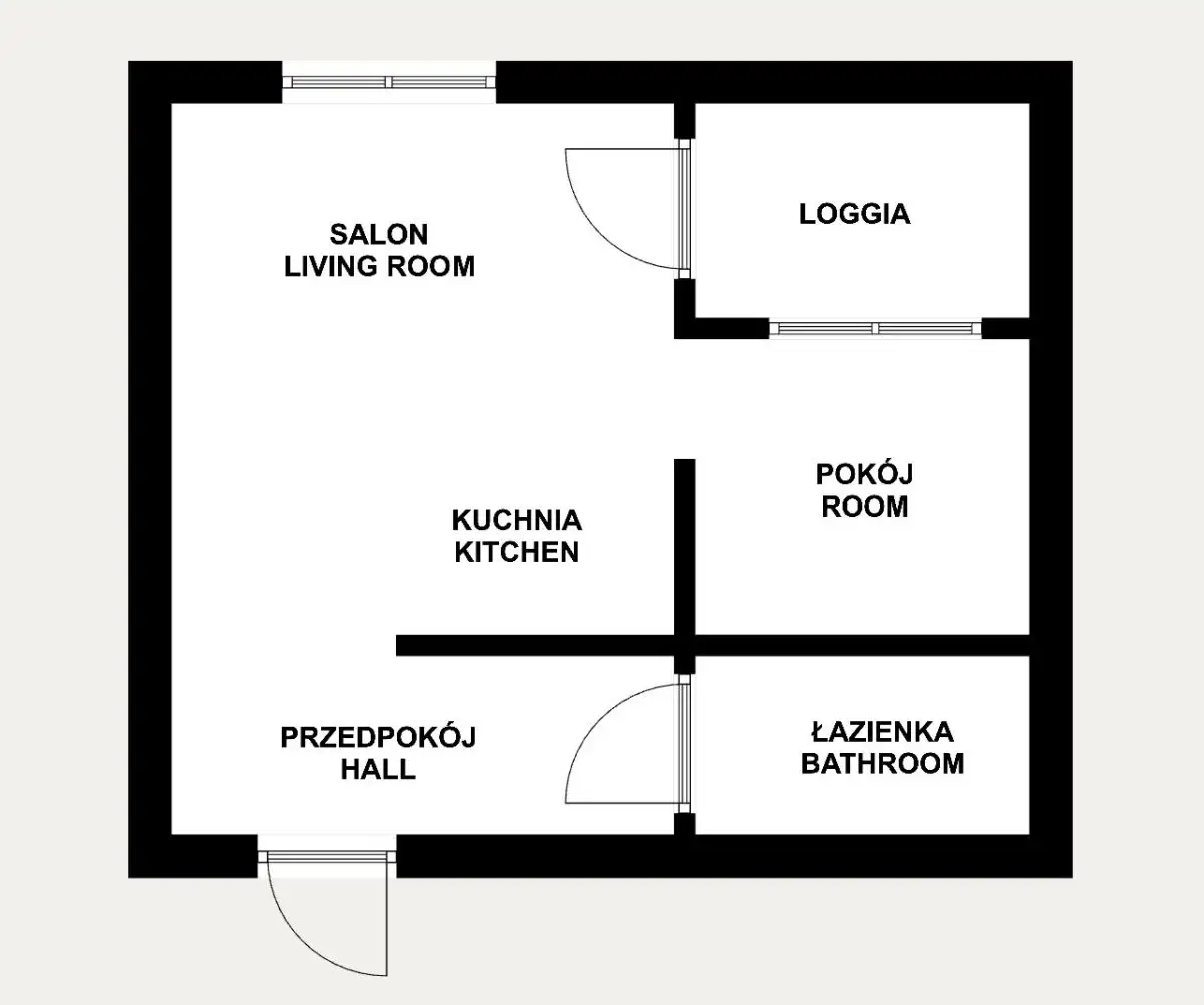 Pokoje: Sypialnia, salon, otwarta kuchnia, przedpokój, łazienka, balkon typu loggia