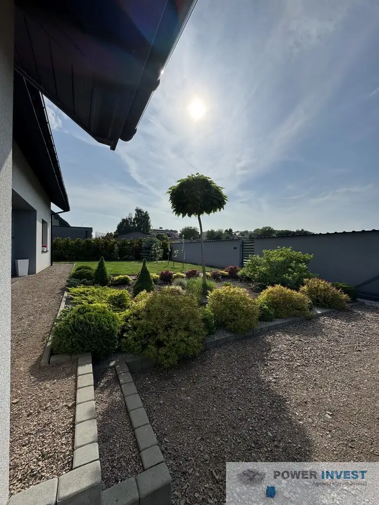 Dom położony jest na 8 arowej działce. Z salonu jest wyjście na taras i estetycznie urządzony ogród. Okna w domu skierowany są na północny- zachód oraz południowy- wschód, dzięki czemu dom jest jasny i dobrze oświetlony.