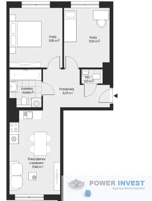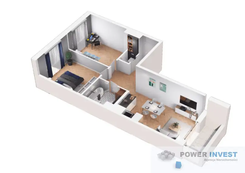 Zlokalizowana na 6 piętrze. Budynek posiada 9 pięter. Mieszkanie o powierzchni 56.19m² tworzą: