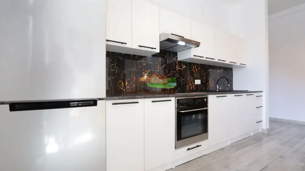 Kuchnia: Lodówka, płyta grzewcza, piekarnik, okap, zabudowa meblowa