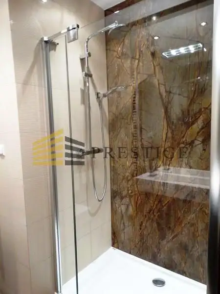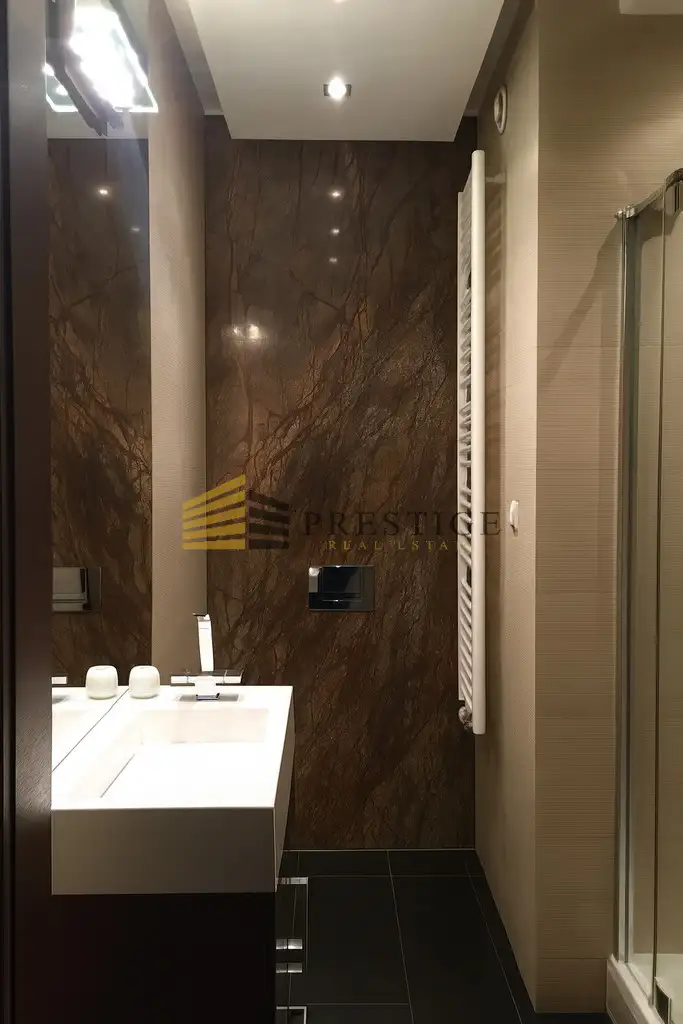 The apartment has been finished to a high standard using materials such as onyx, marble, and travertine. Elegant lighting throughout the rooms. The living room windows offer a beautiful view of the Warsaw skyline.