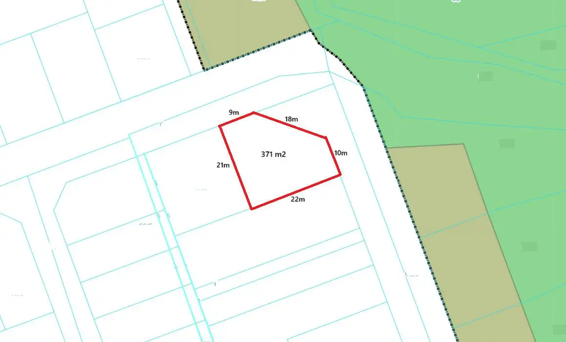 Działka narożna o powierzchni 371m², wymiary podane na zdjęciach.