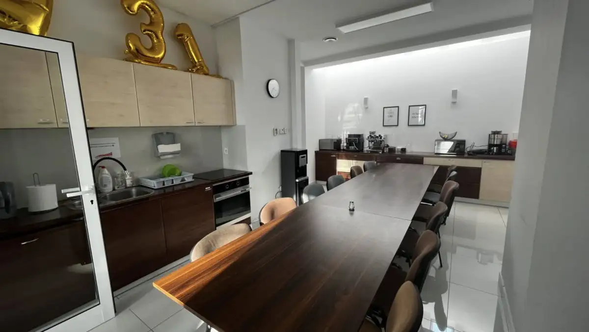 - Gotowa infrastruktura socjalna: W pełni wyposażona, przestronna kuchnia (27 m²) oraz dwa duże tarasy (75 m² i 52 m²) to idealne miejsca do integracji zespołu i nieformalnych spotkań.