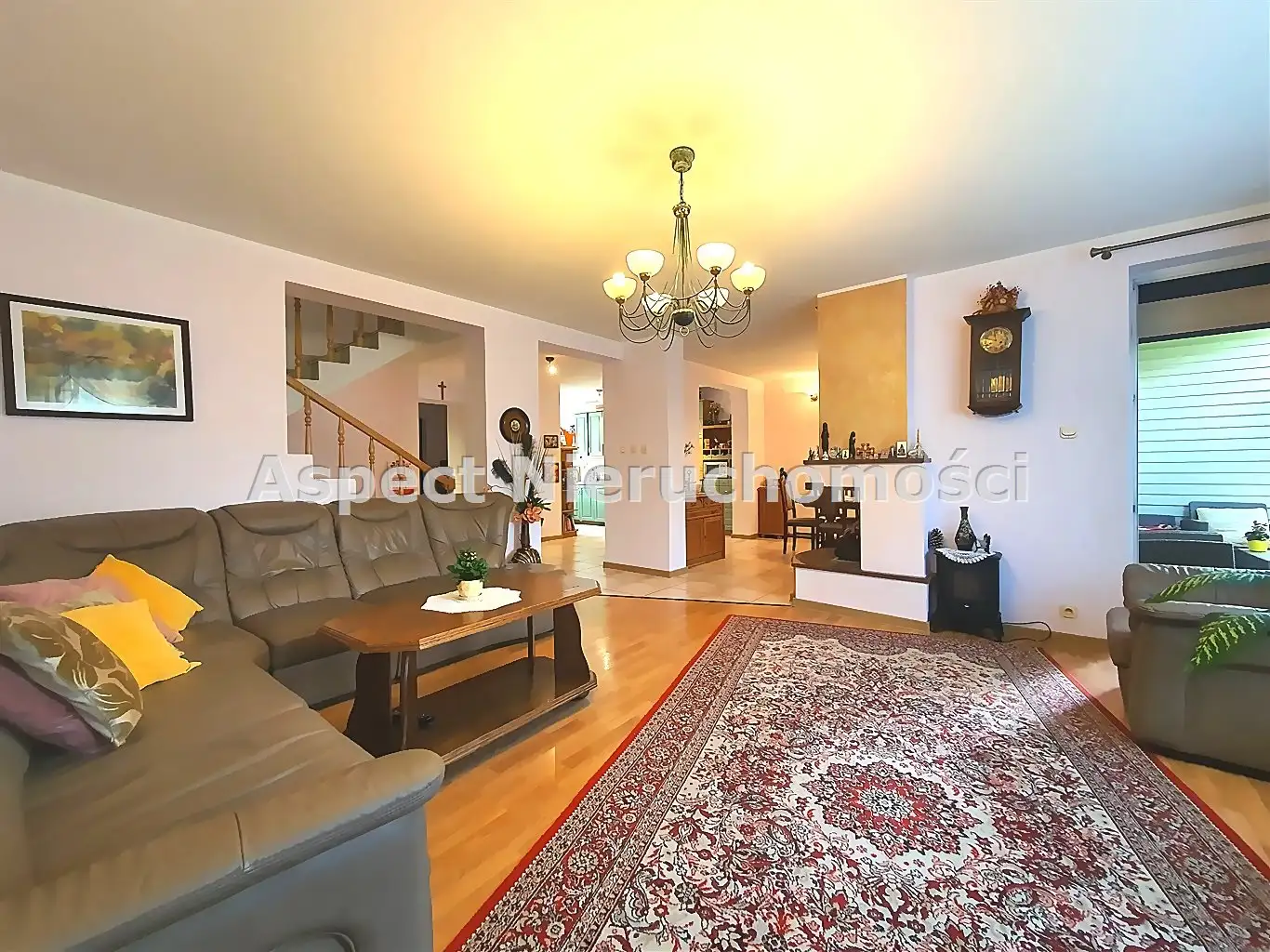 Przestronny salon z kominkiem i wyjściem na ogród,