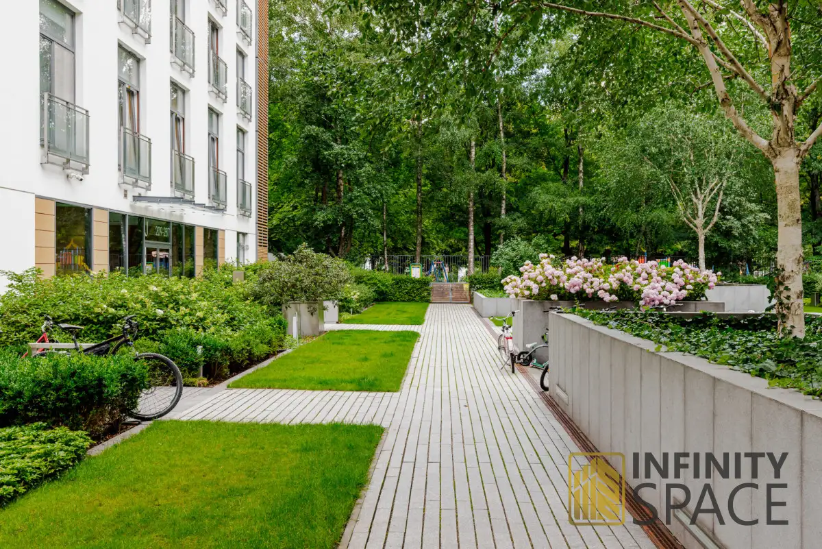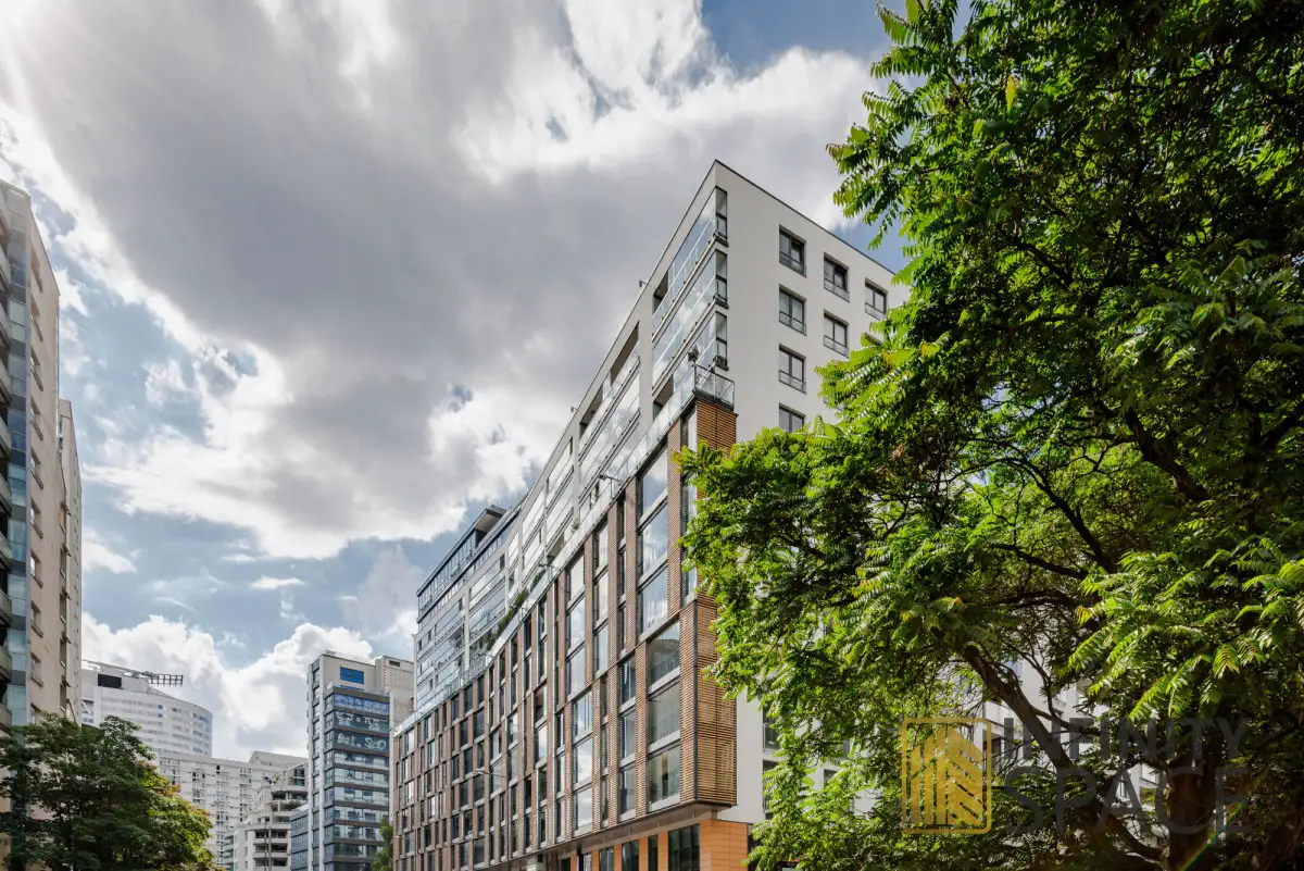 BUILDINGThe building has been designed with attention to the comfort of its residents - it has a 2-level garage hall and a retail and service area. Each staircase has 2 lifts. The flats, located in a prestigious location, are an example of modern architecture and exclusive finishes. The building of varying heights forms a U letter open towards the park, and the best modern materials were used in its construction. Safety is guarded by 24-hour security and there is also CCTV.