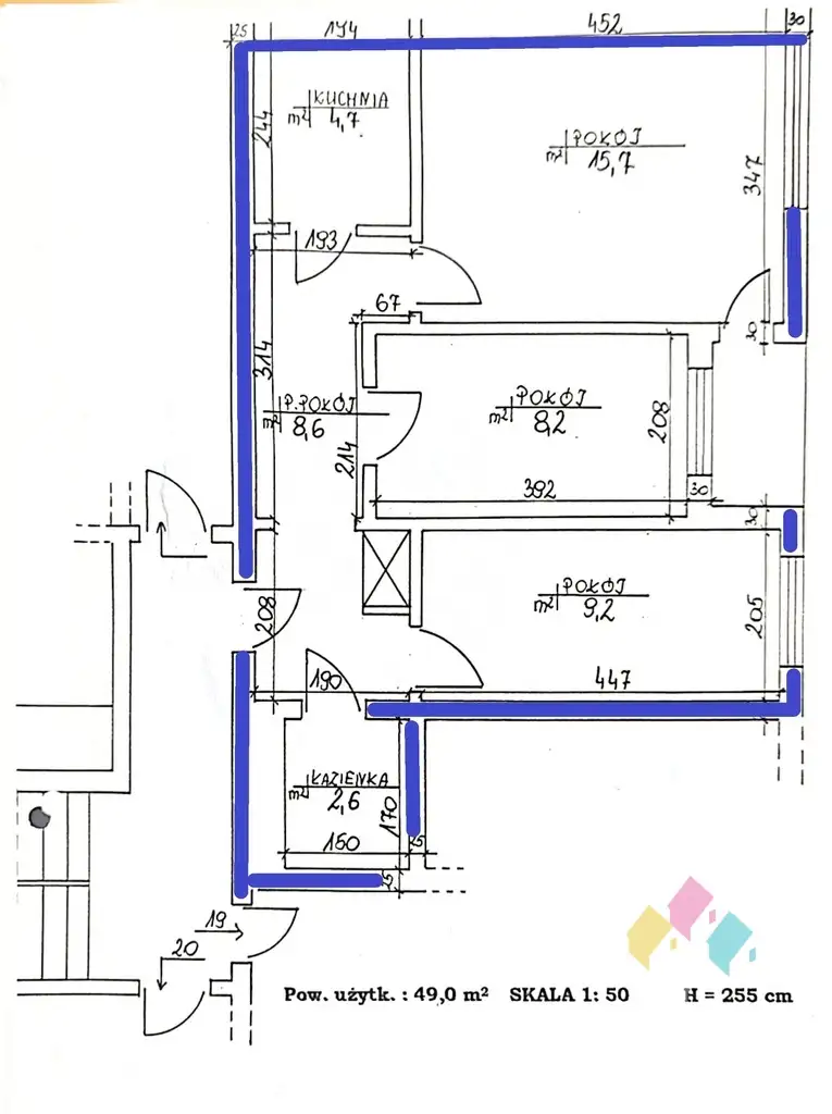 - 3 niezależne pokoje 15,7 m², 8,2 m², 9, 2m²,