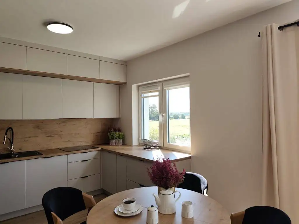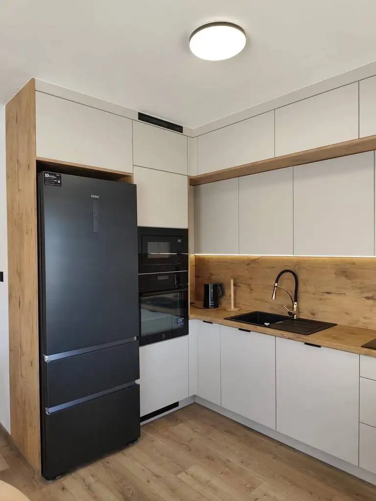 meble kuchenne w zabudowie ze sprzętem AGD ( duża lodówka z zamrażarką, zmywarka 60 cm, płyta indukcyjna, piekarnika i mikrofalówka w zabudowie meblowej , rozkładany stół + 4 krzesła