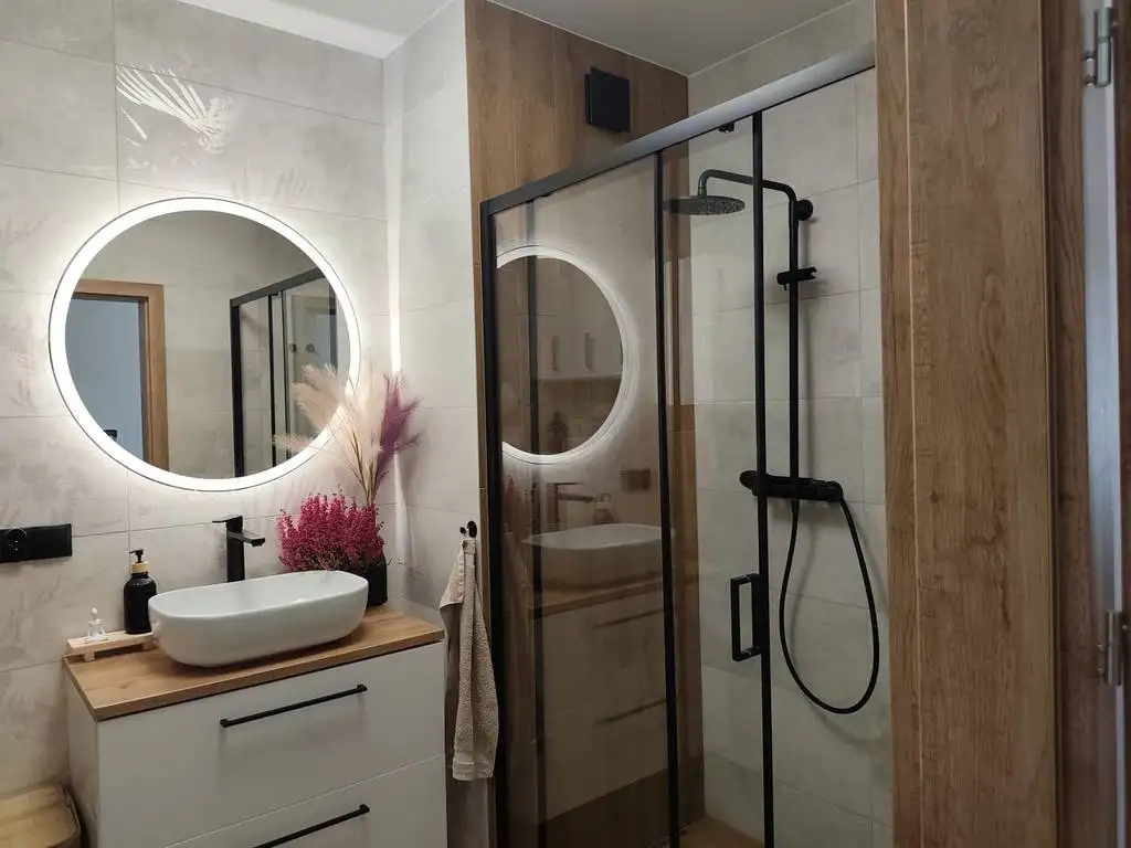 łazienka z dużą kabiną prysznicową i odpływem liniowym